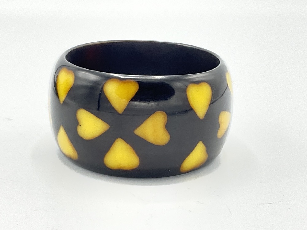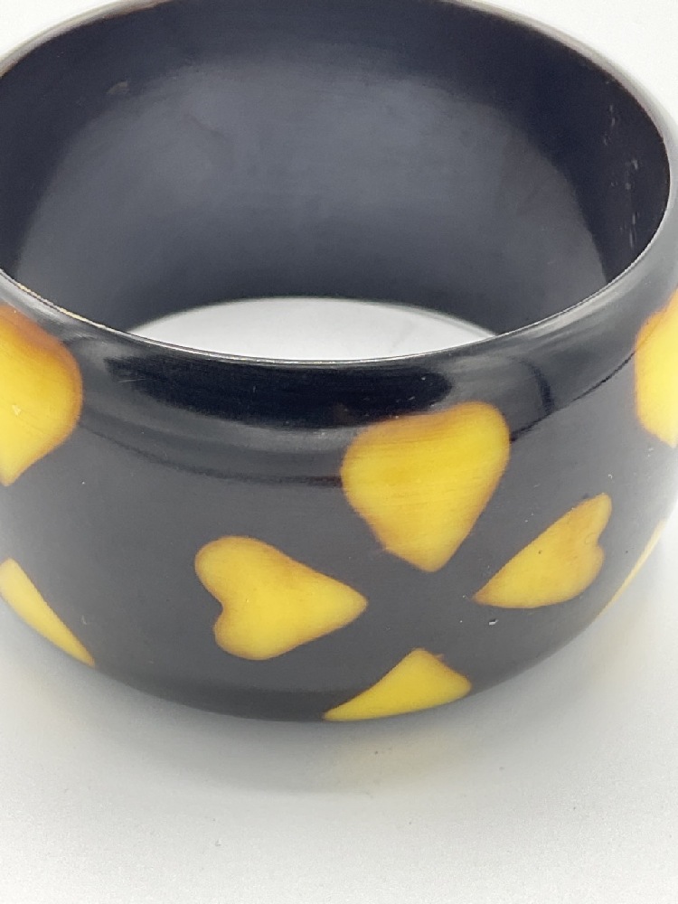 Bakelite Laminated Black and Ivory Hearts Bangle Bracelet.