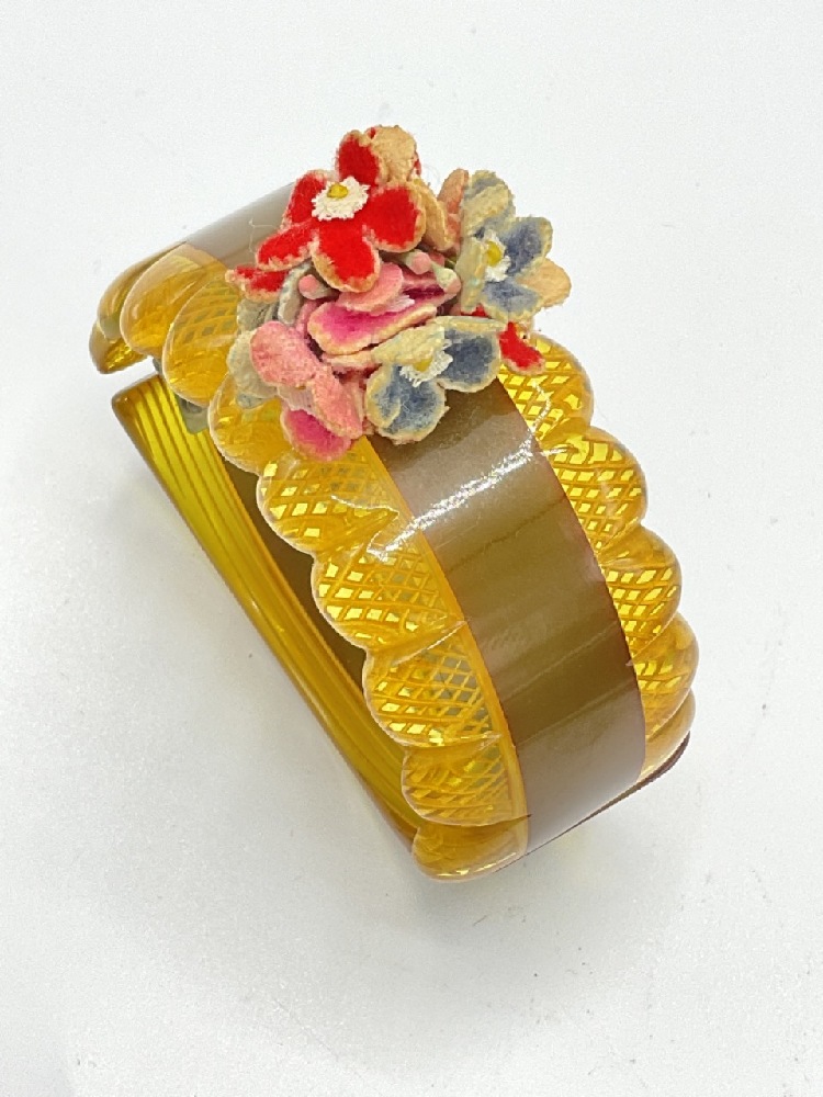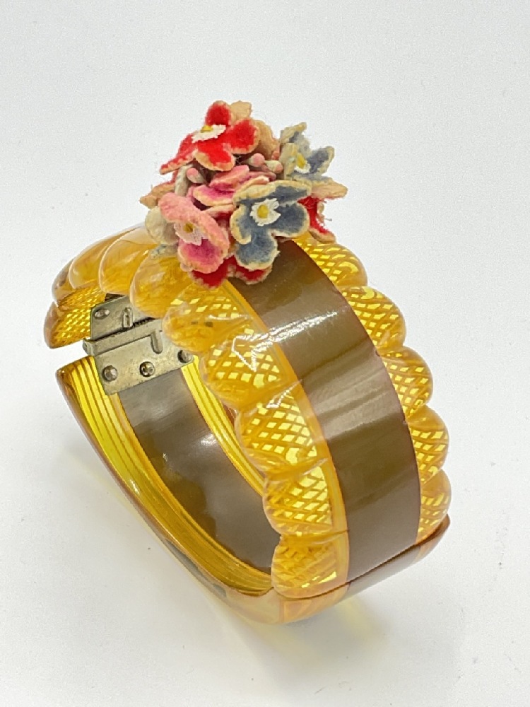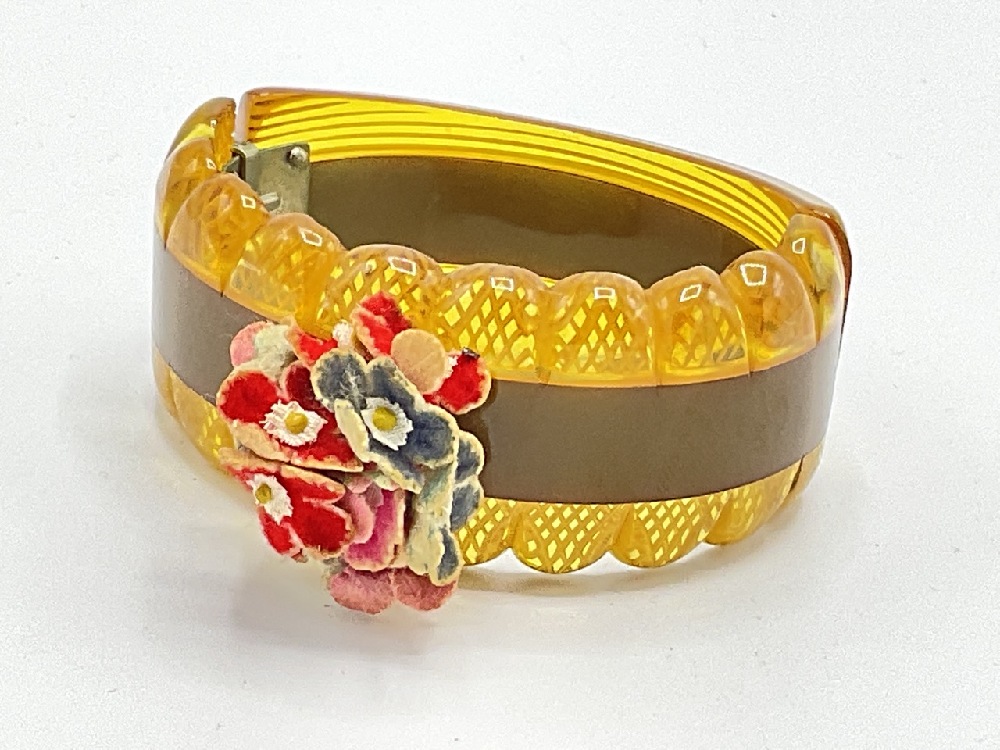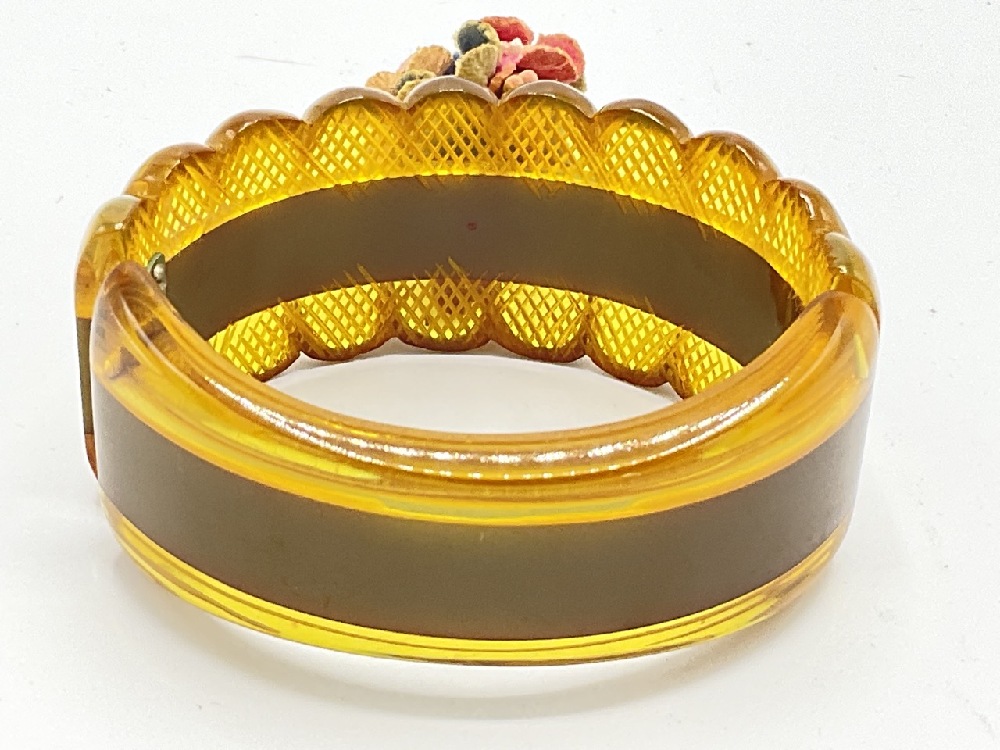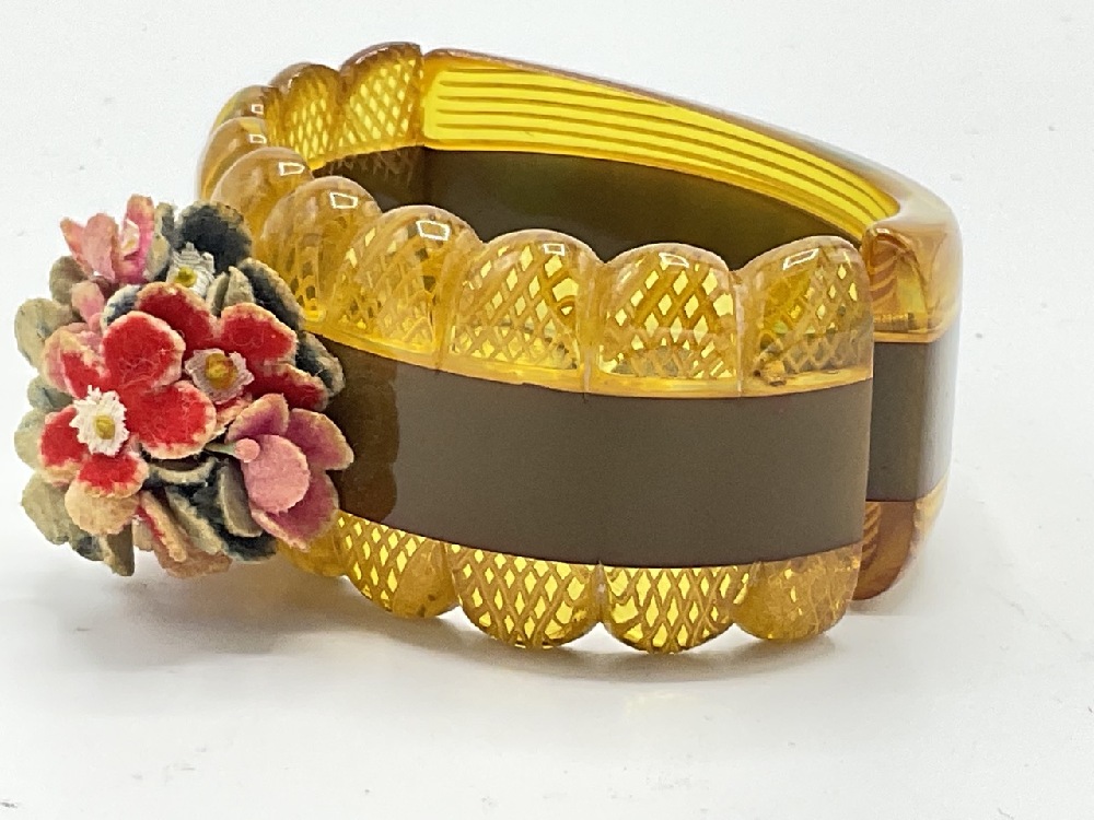 A reverse carved apple juice bakelite and olive green laminate clamper bracelet with applied floral bouquet provably made out of leather pieces.