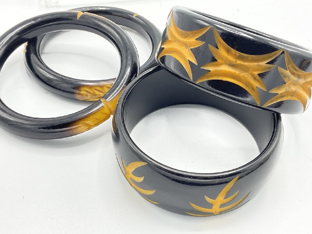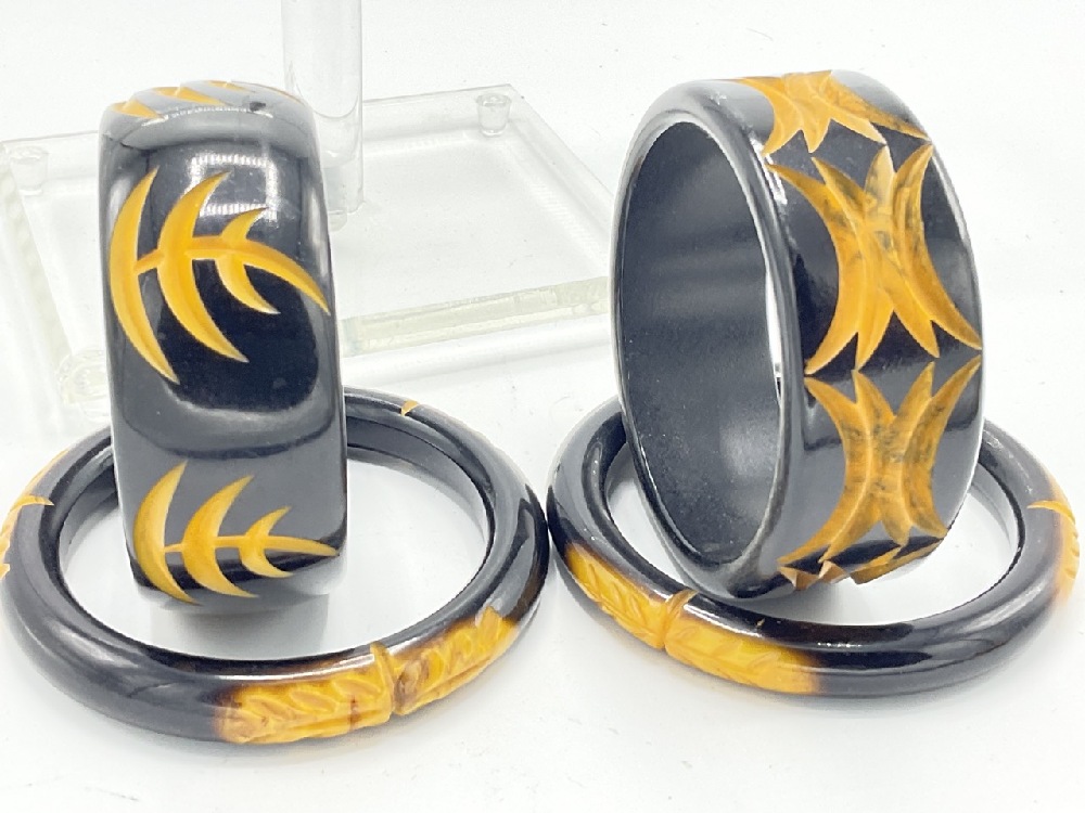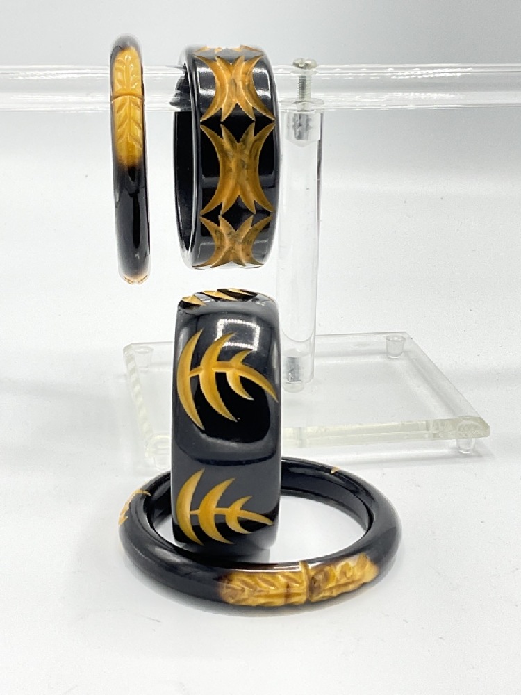 Black and butterscotch laminate bangle bracelets with carved geometric designs.