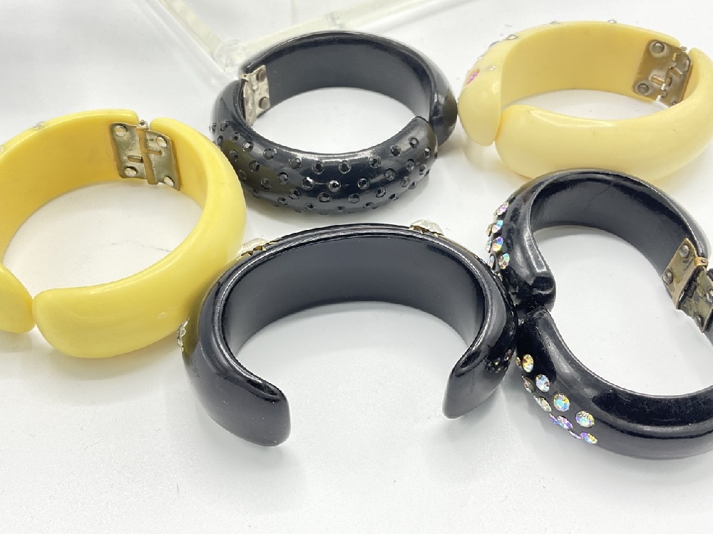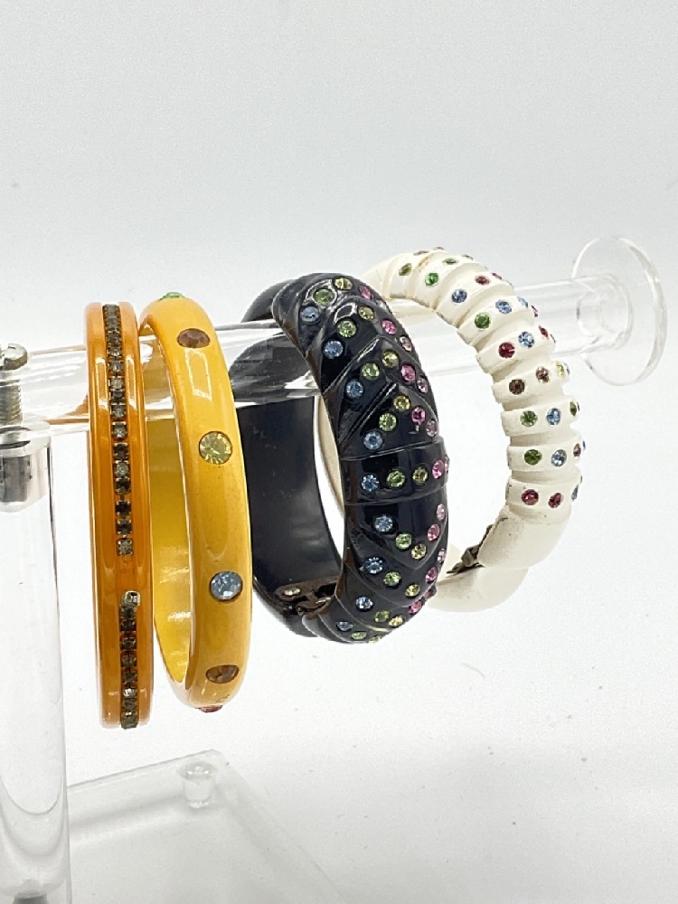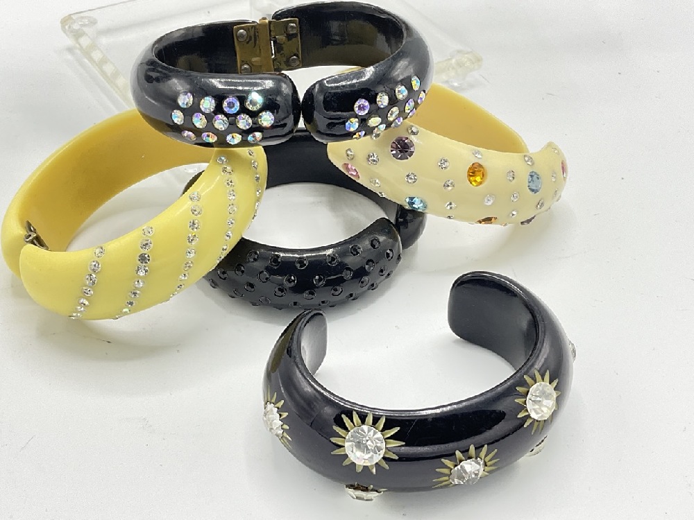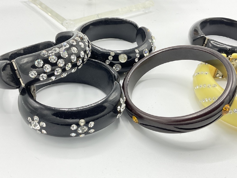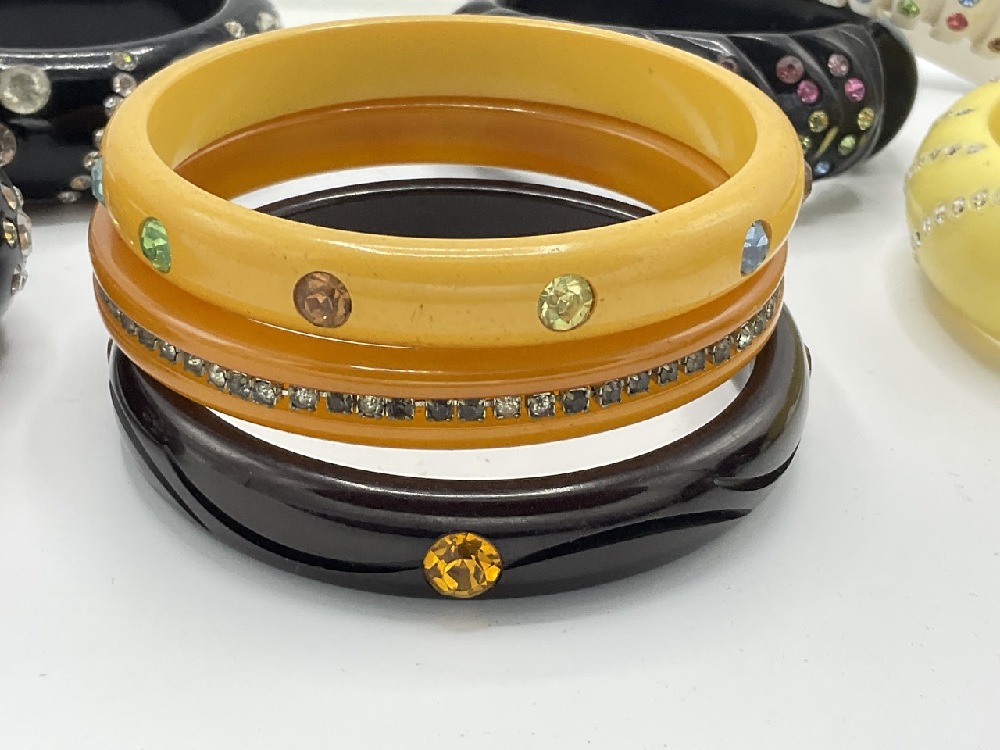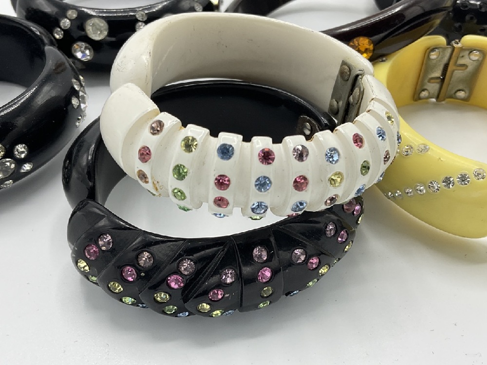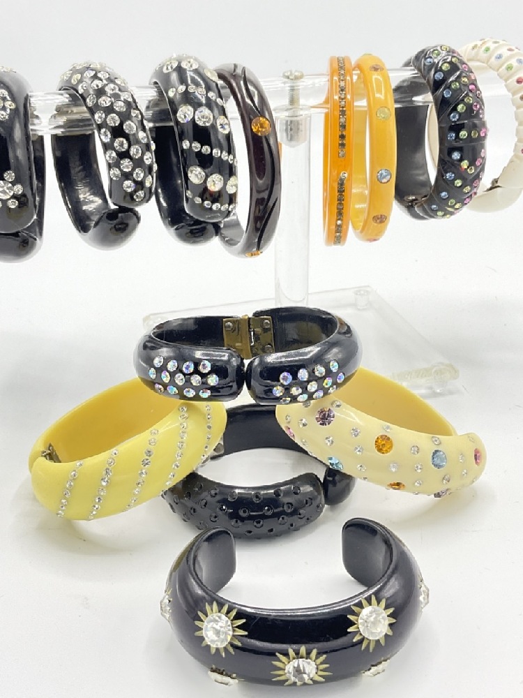Thirteen (13) vintage jeweled Bakelite clamper and bangle bracelets. Three bangles with rhinestones, one black cuff with bright rhinestones and remaining nine are clamper bracelets.
