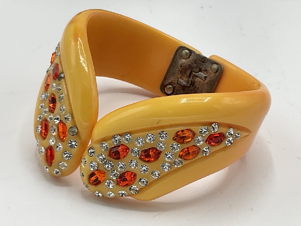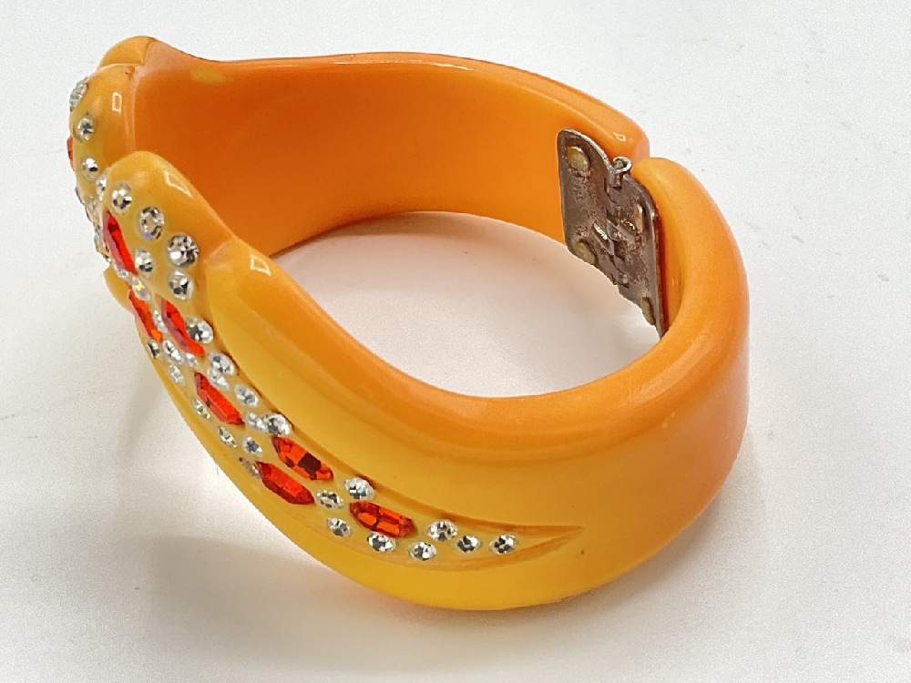 An Art Deco yellow to orange colored vintage Bakelite clampber bracelet with bright red/orange rhinetones.