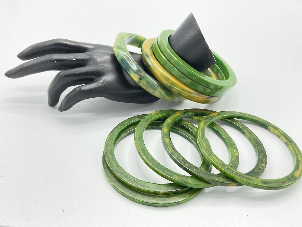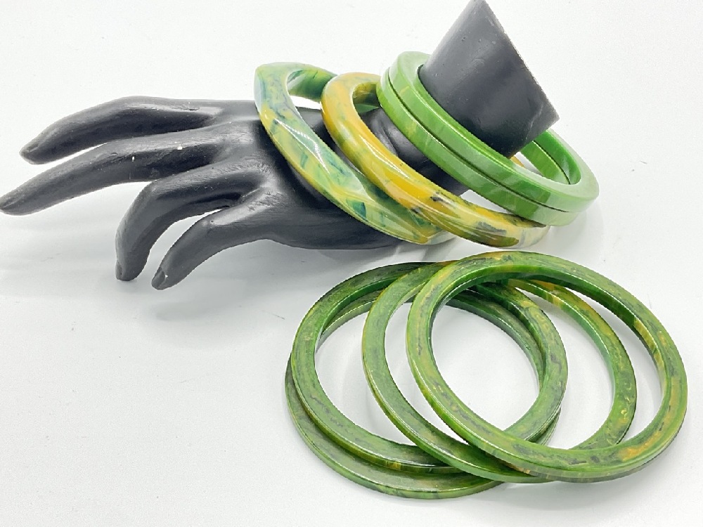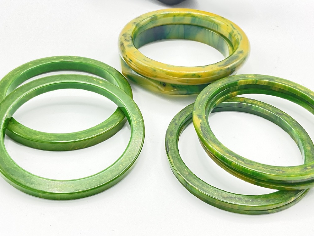 Nine (9) vintage Bakelite creamed spinach bangles. Thin set of five, pair of 1/4” thick and two stand alone bangles.