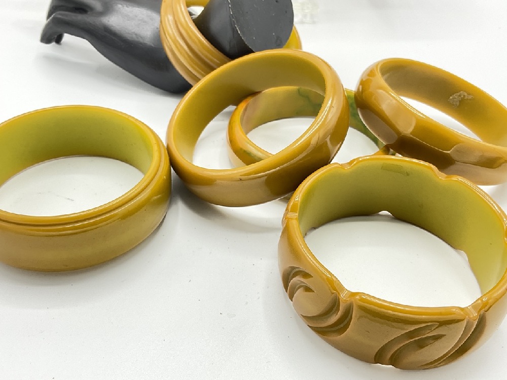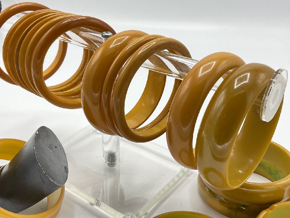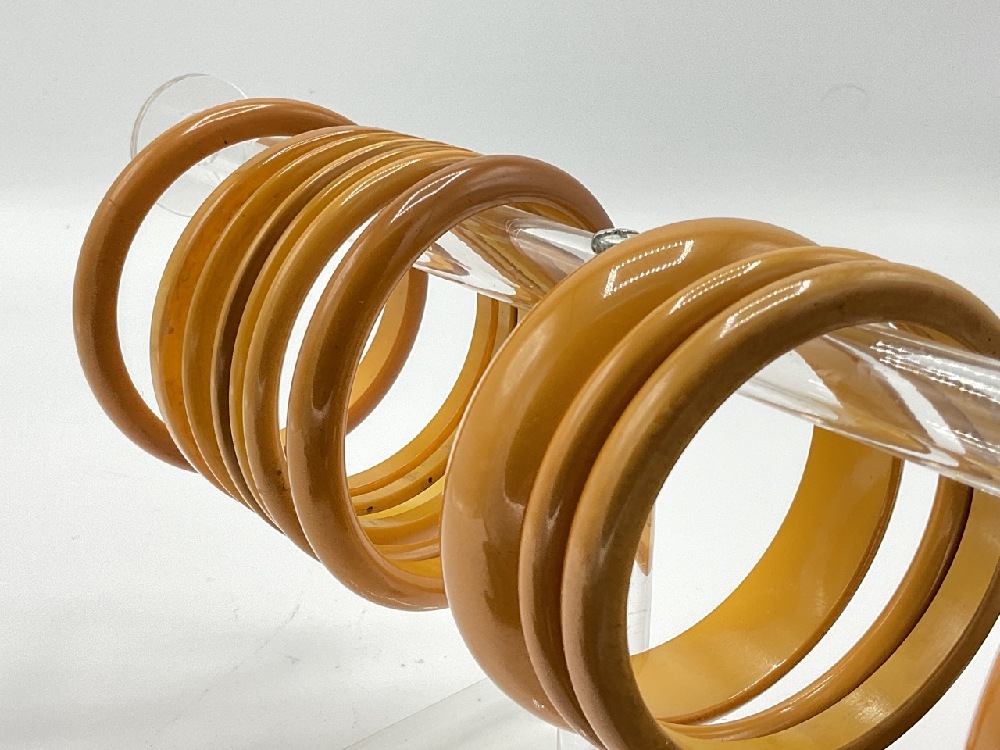 Eighteen (18) Vntage Bakelite bangle bracelets. Buttersotch, Caramel and Olive green tones.