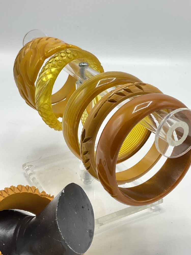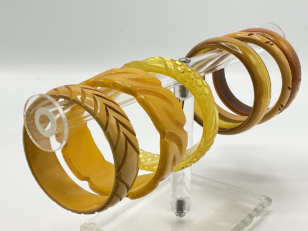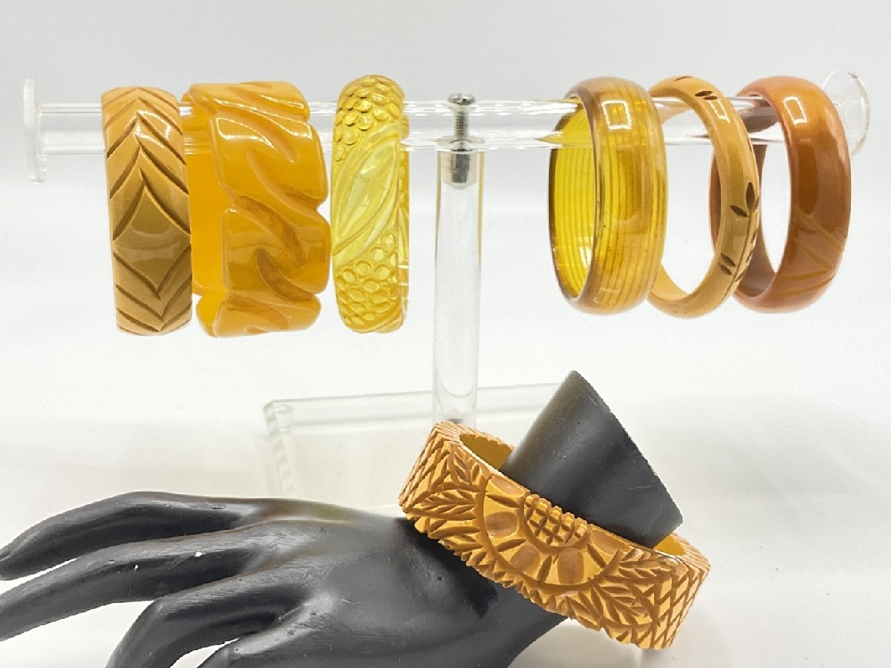 Six (6) Bakelite bangle bracelets. Ribbed apple juice bakelite, Butterscotch with carved sunflowers, geometrics and yellow tones.
