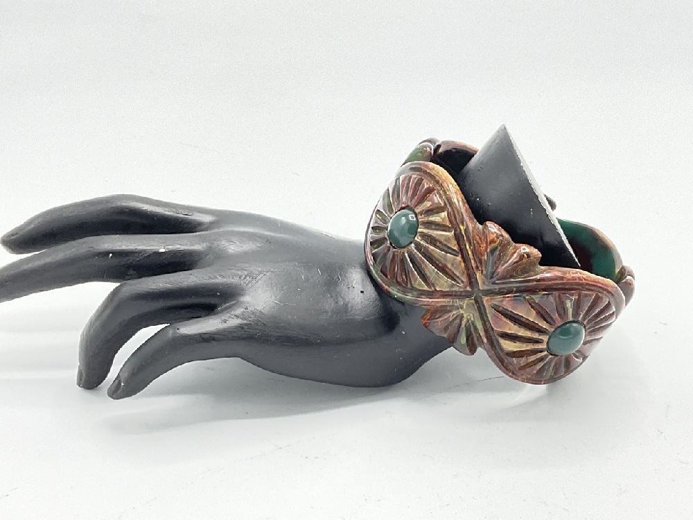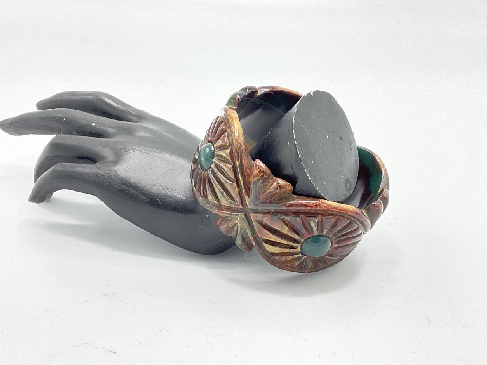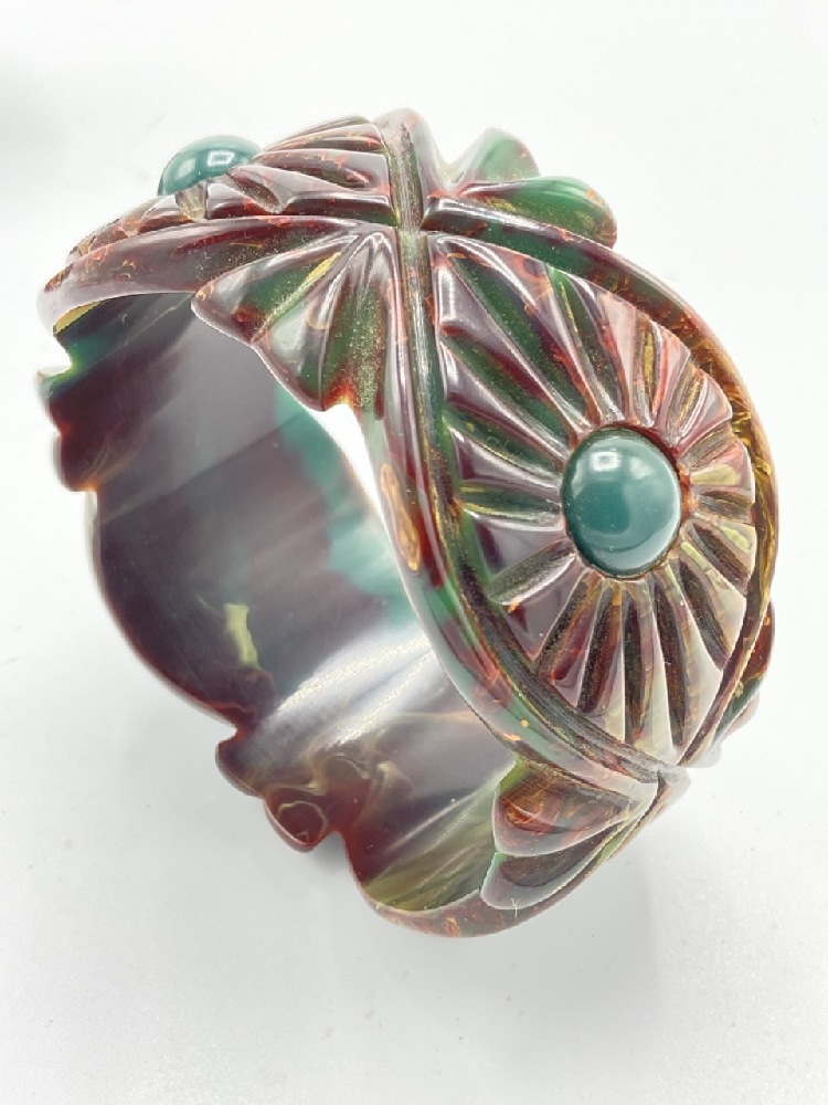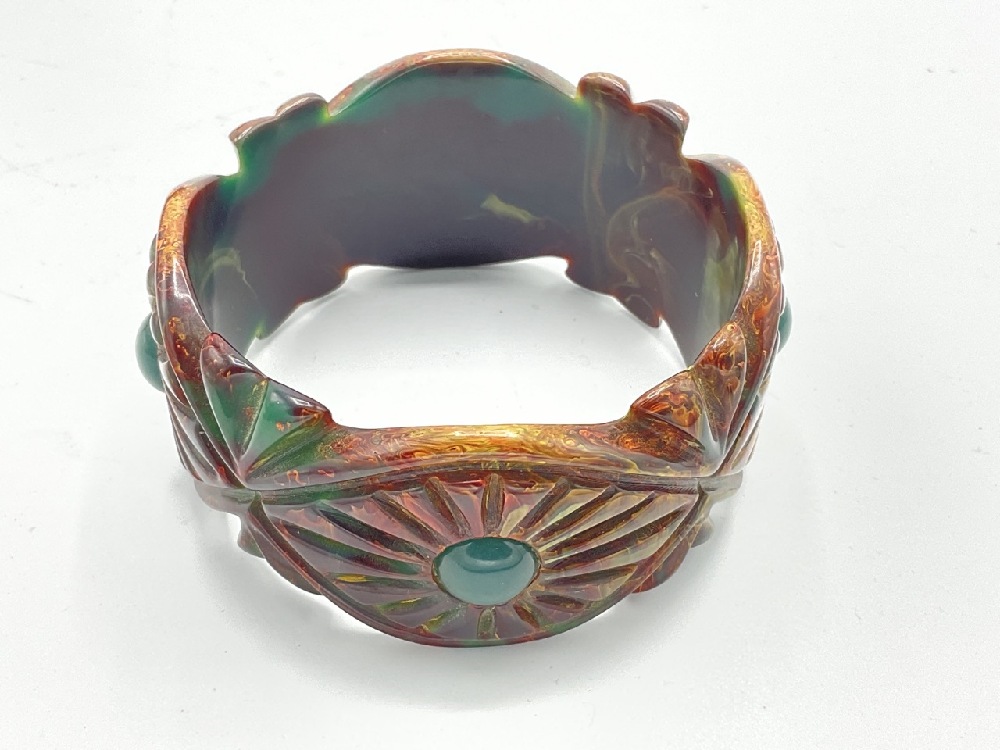 Vintage Carved Bakelite Bracelet with marbled red and green blue coloring.