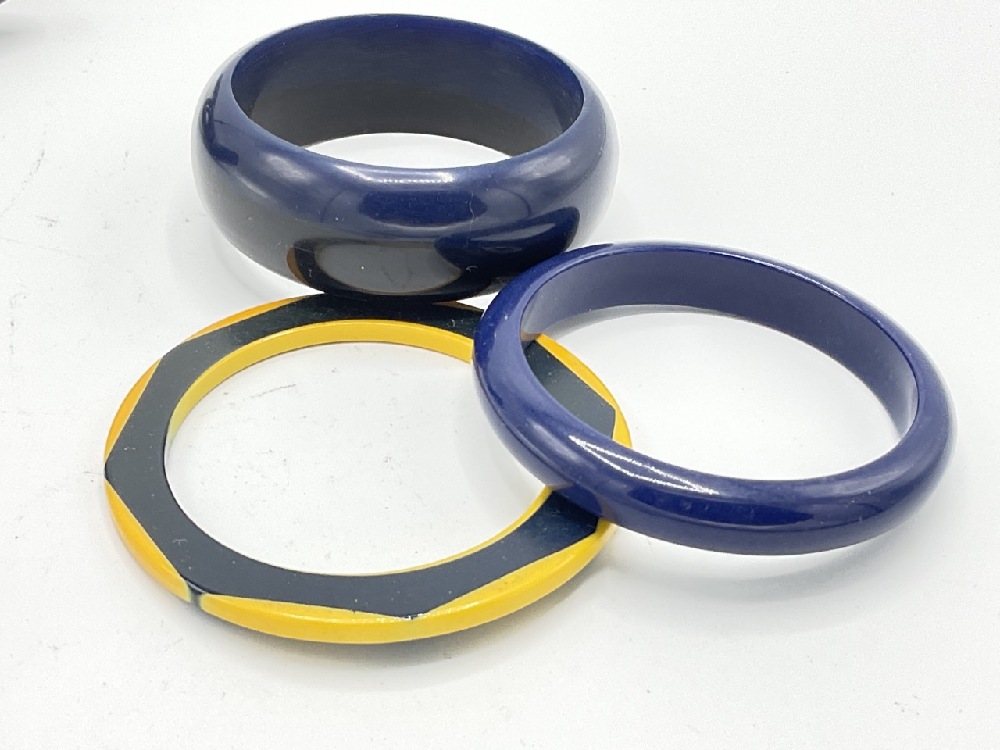 Three (3) Bakelite Bangles including wide band black and blue laminate, butterscotch and blue laminate and blue.