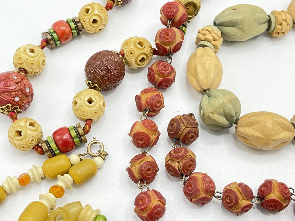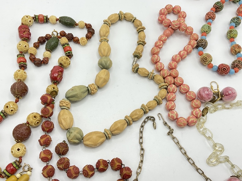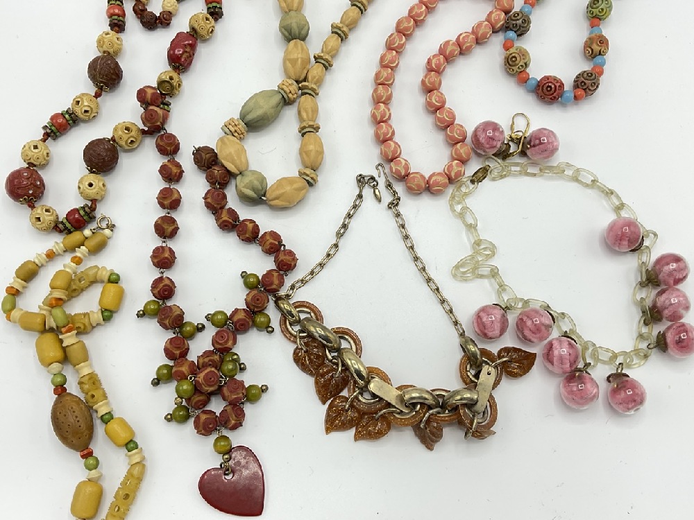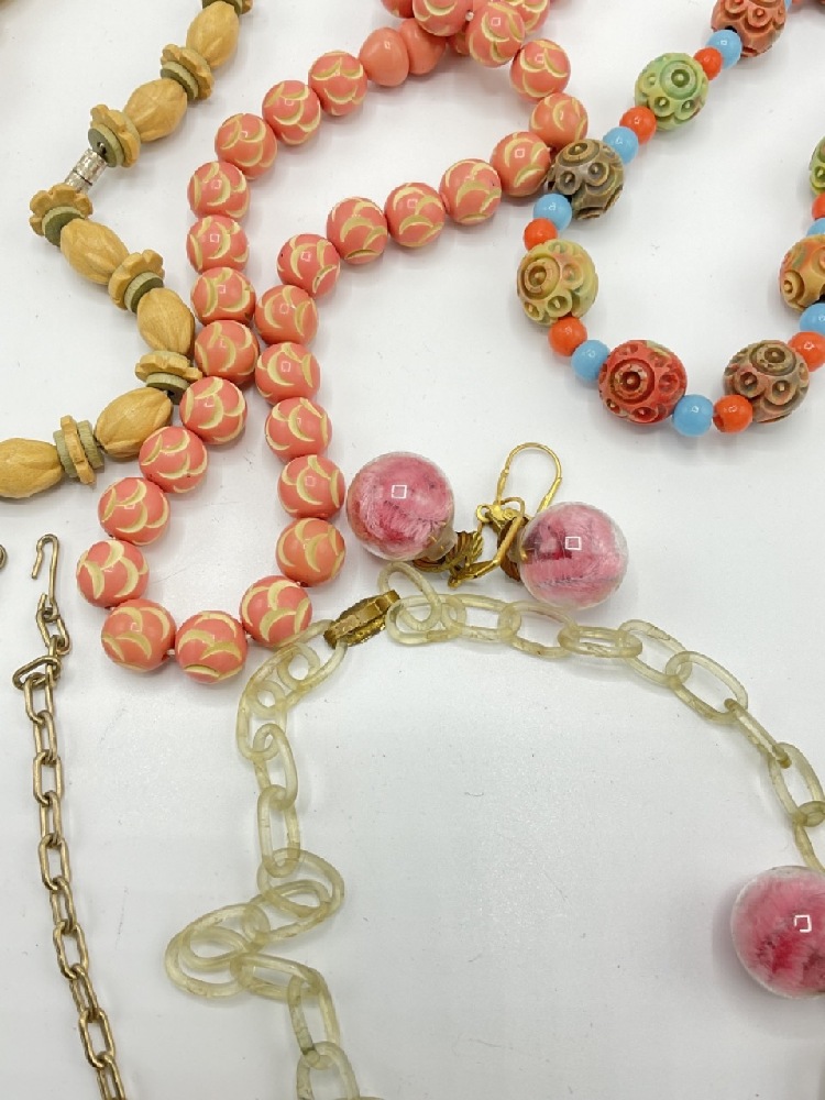 Eight (8) assorted Celluloid and Bakelite carved necklaces. One with encapsulized pink pipe cleaner puffs with matching earrings.