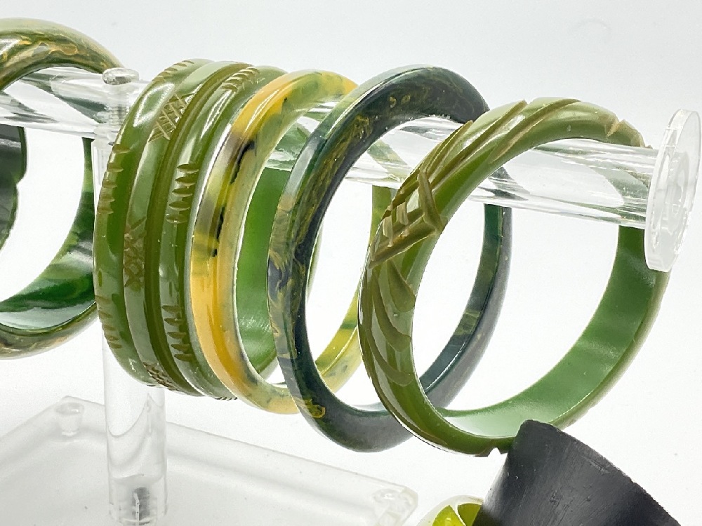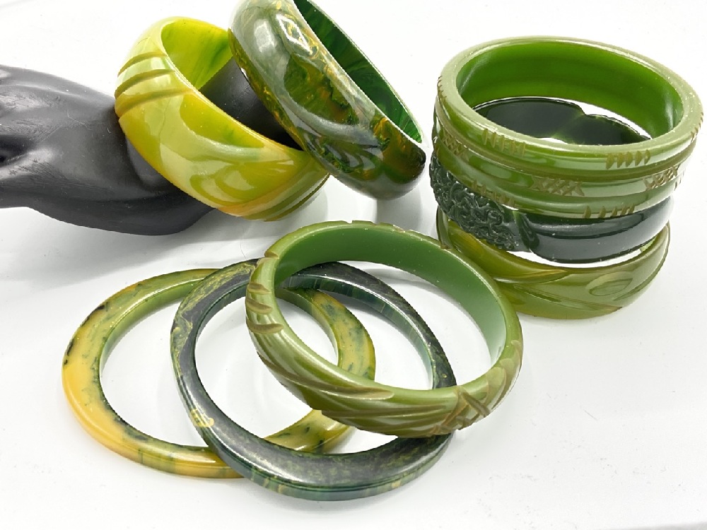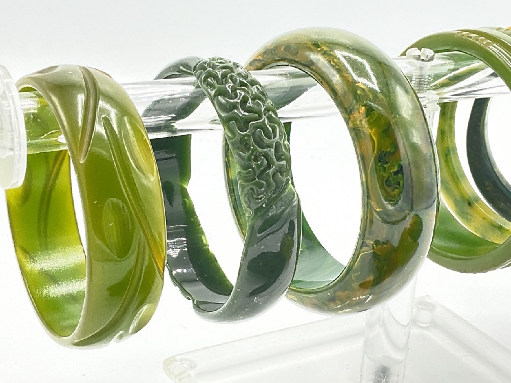 Eight (8) Vintage Bakelite Bangle Bracelets. Various Greens, Olive, Creamed Spinach etc.