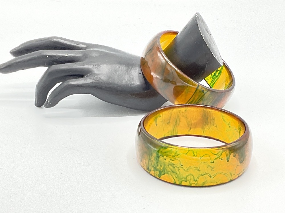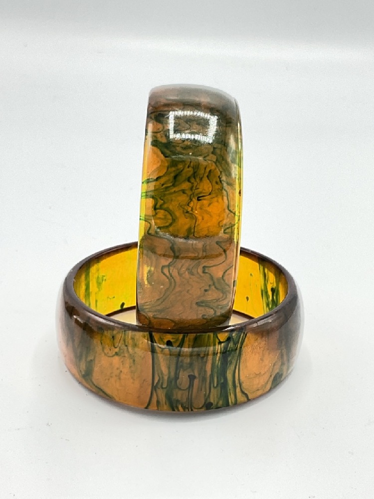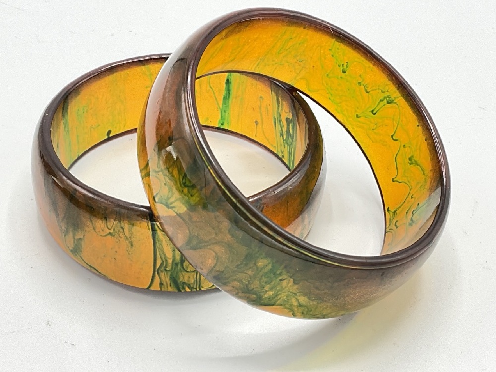 A pair of apple juice Bakelite bangles with greenish blue splash marks through out.