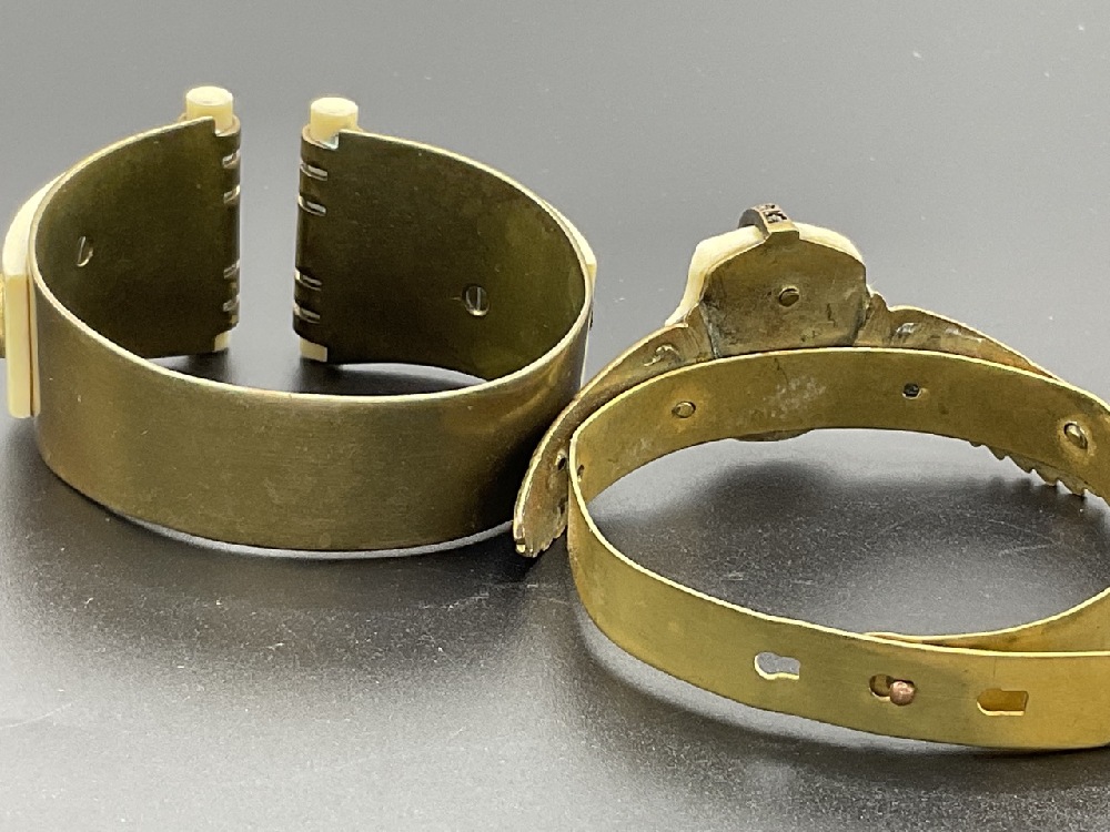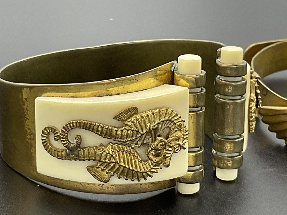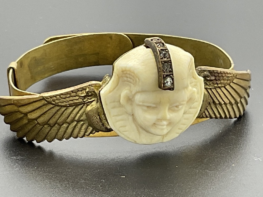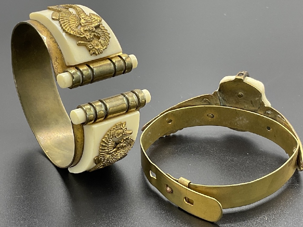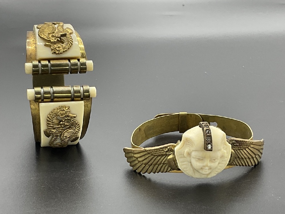 Two (2) 1920's Metal with mounted articulated Bakelite Egyptian Revival King Tut With Wings and Sea Horses Bracelet.