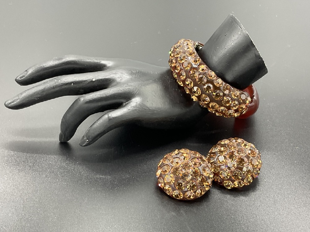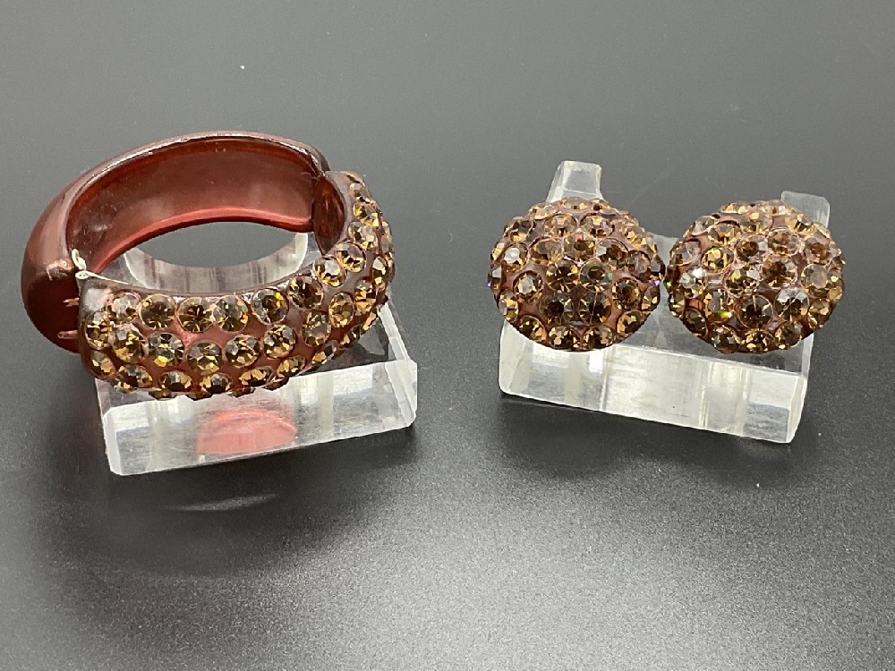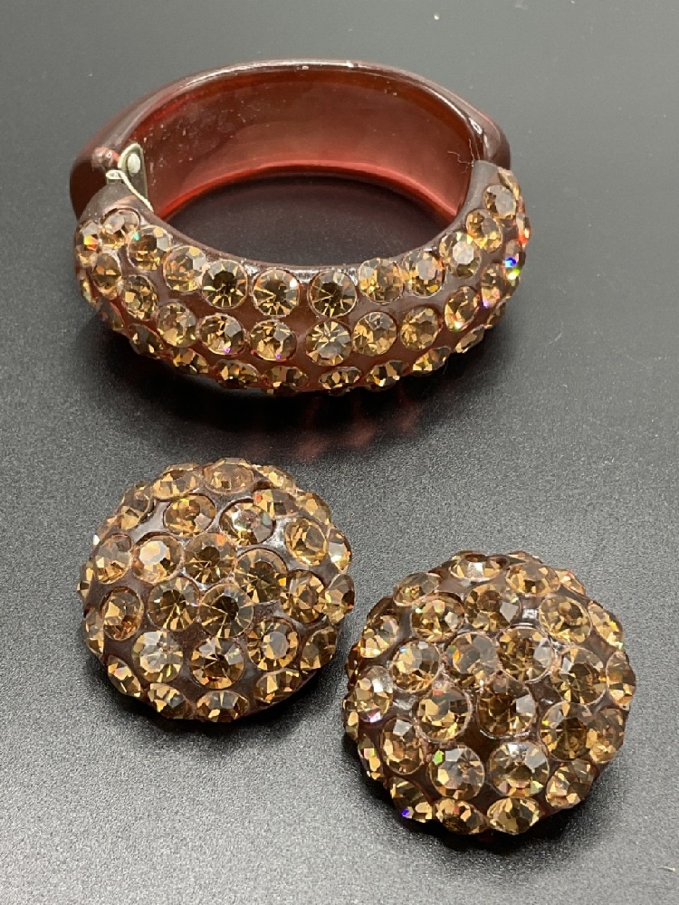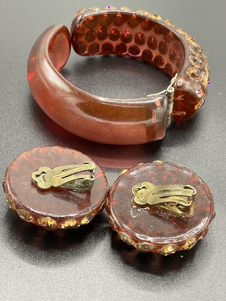 Bakelite hinged clamper bracelet with earrings.