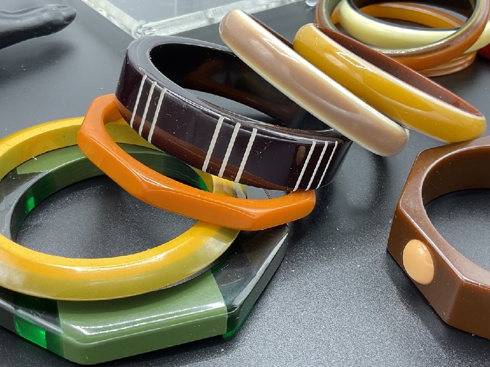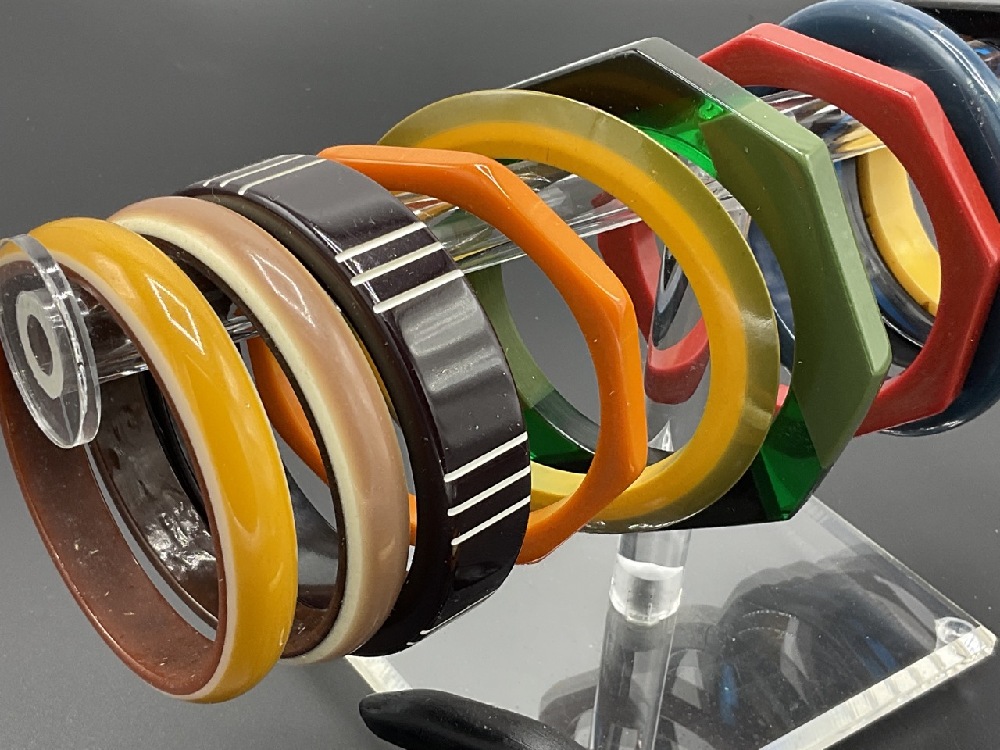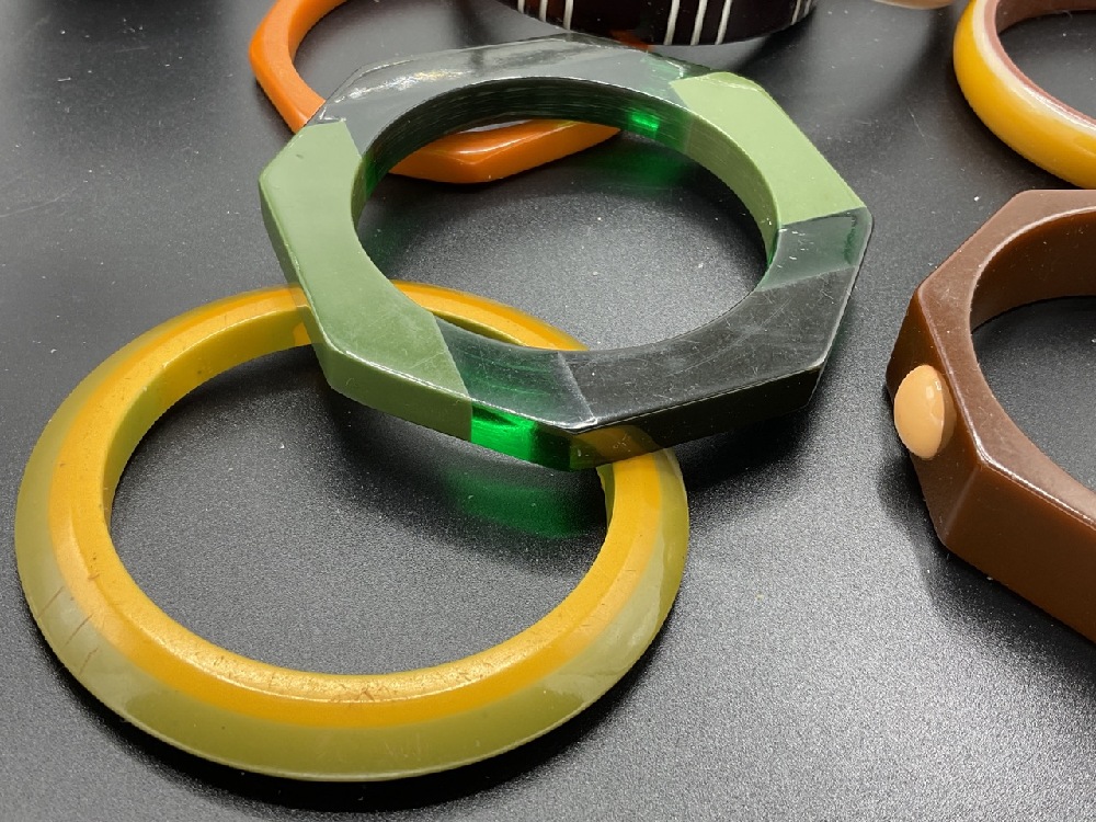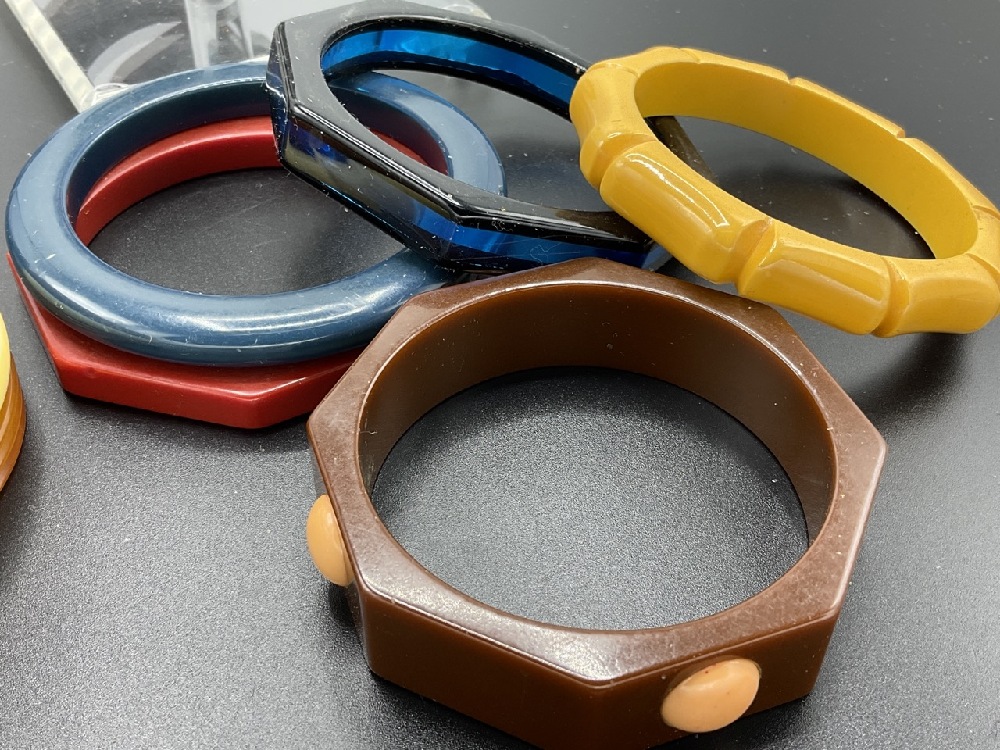 Fourteen (14) Vintage Art Deco Bakelite bangle bracelets. Laminate, Dot, Laminate greens, blues, butterscotch etc.