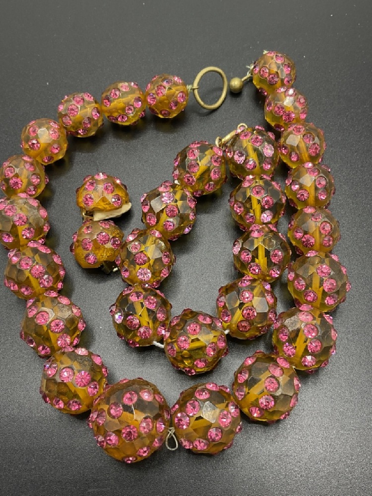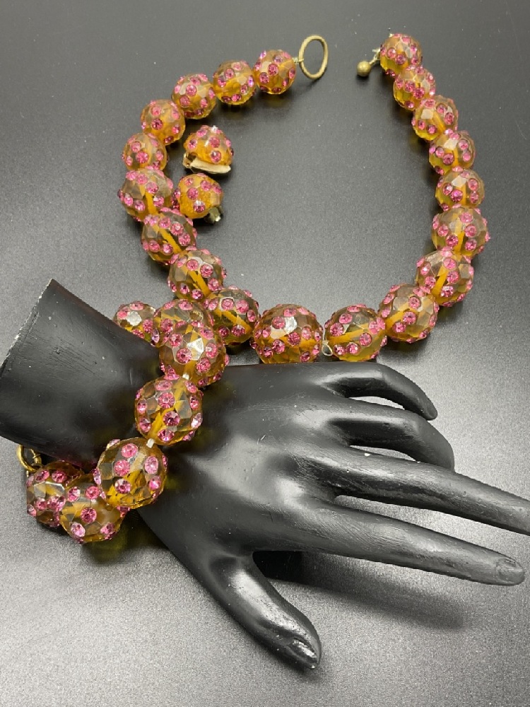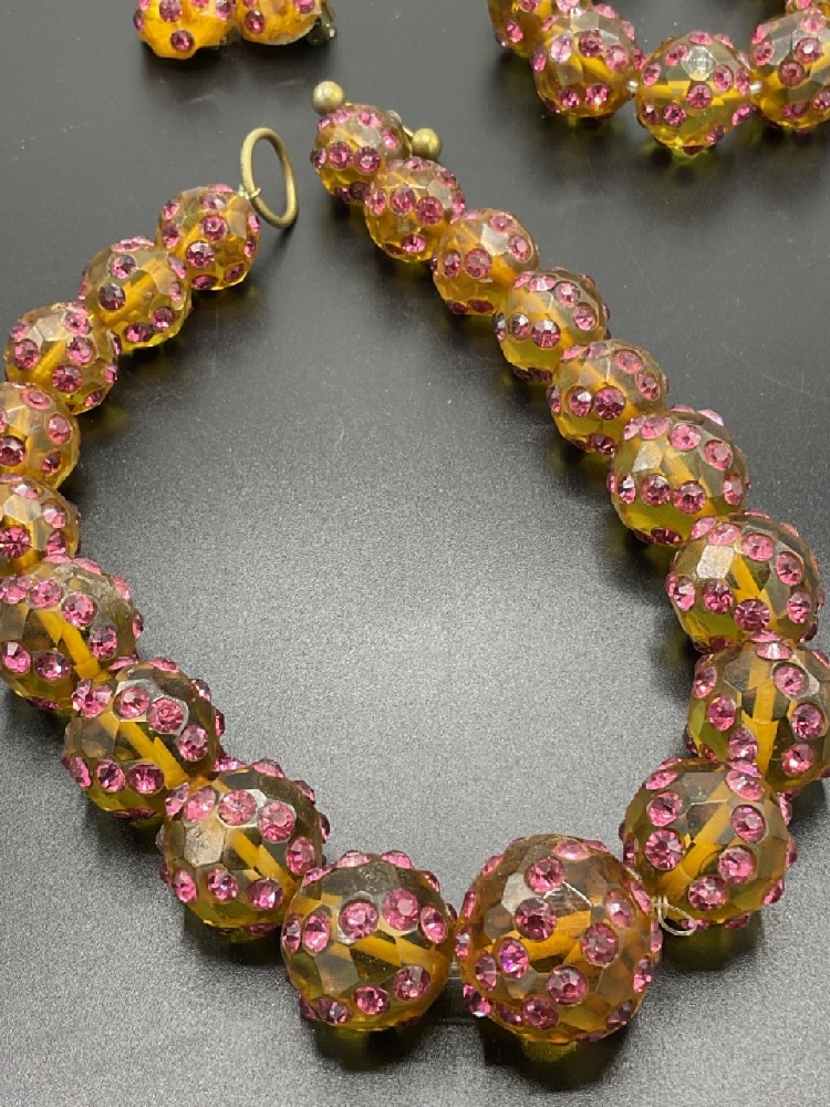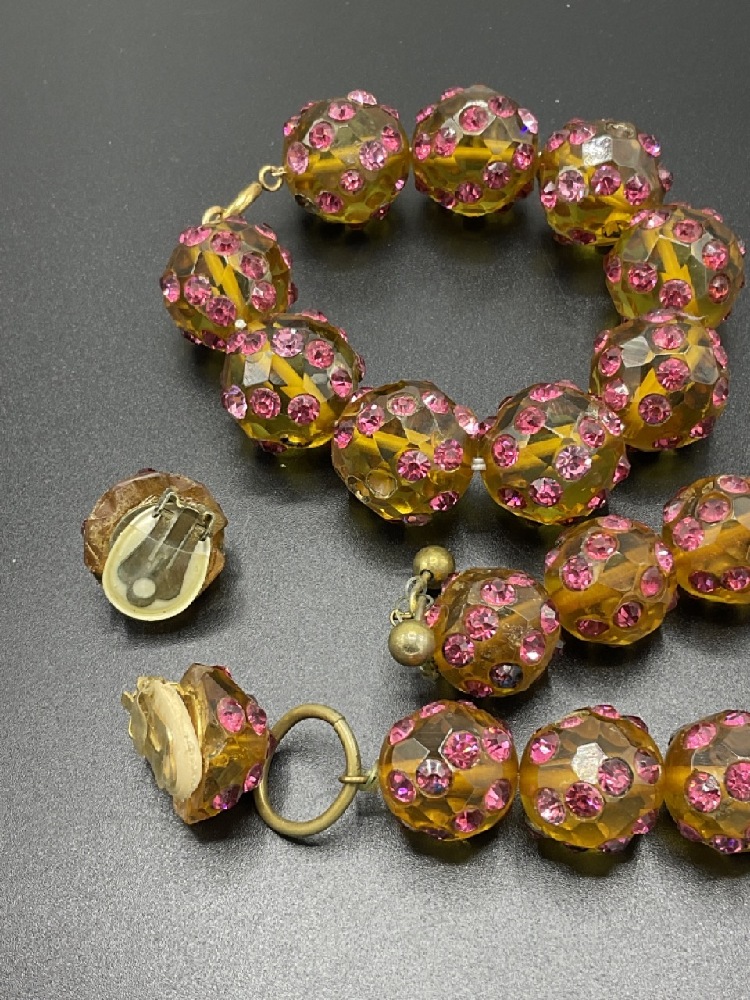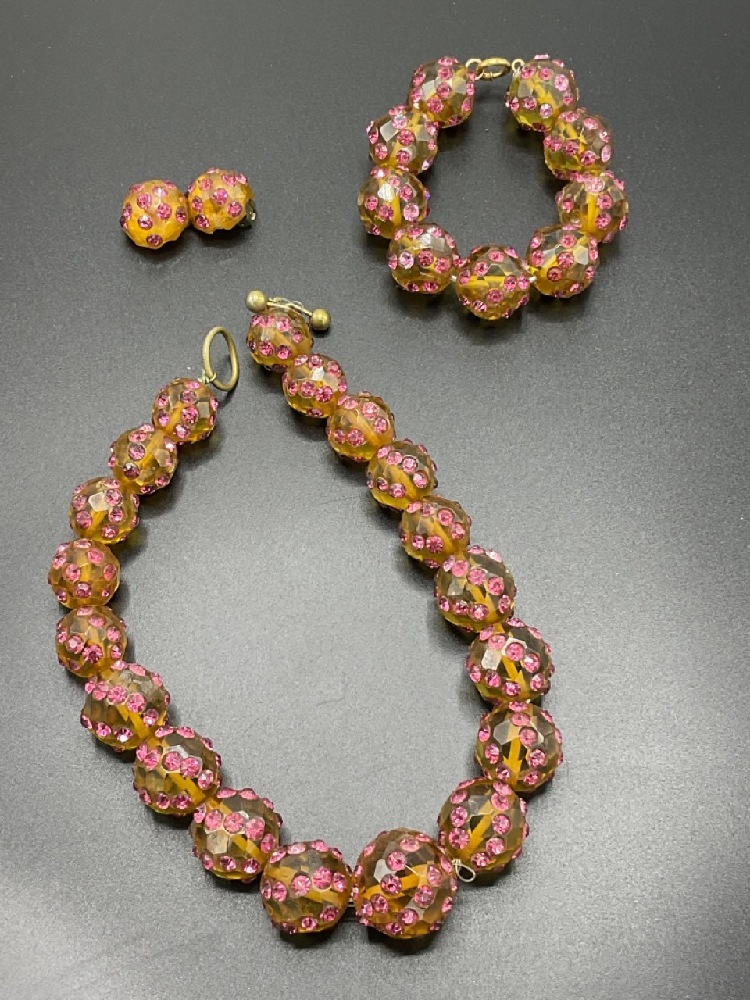 Bevel cut amber glass and rhinestone encrusted parure set. Necklace is 16" length, bracelet 7" and earrings are 3/4" d.