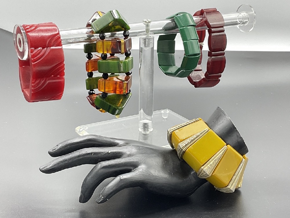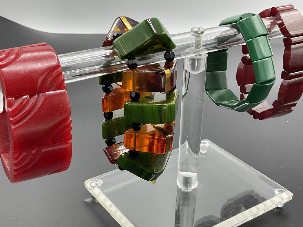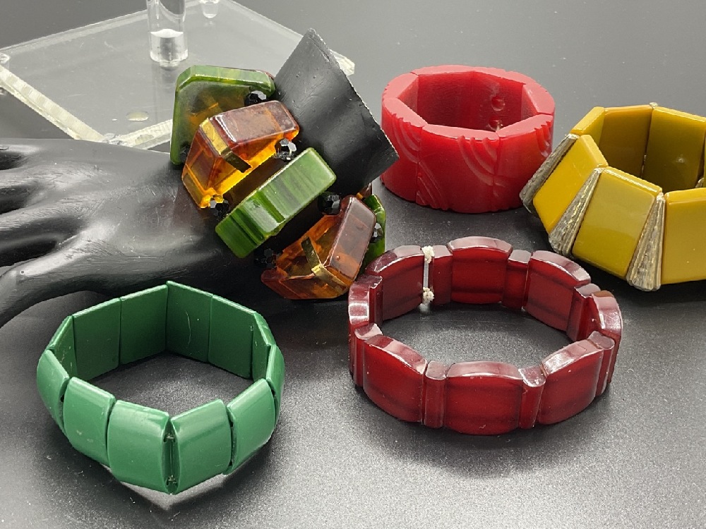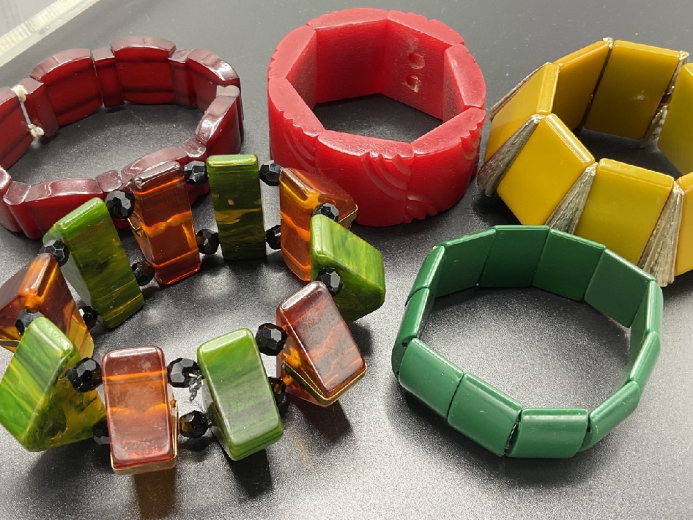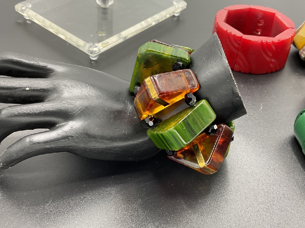 Five (5) Vintage Bakelite Stretchy Bracelets. Green, red, creamed spinach with tortoise and butterscotch. As seen in photograph preview.