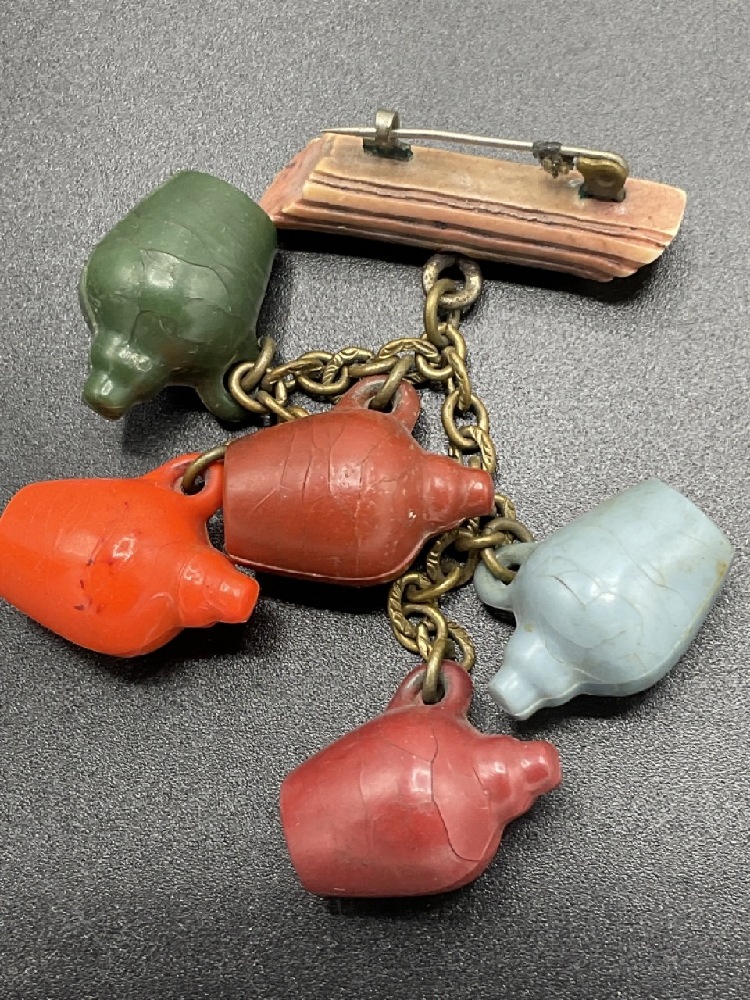 Vintage Bakelite Stoneware Jugs Dangling from wood log pin.
