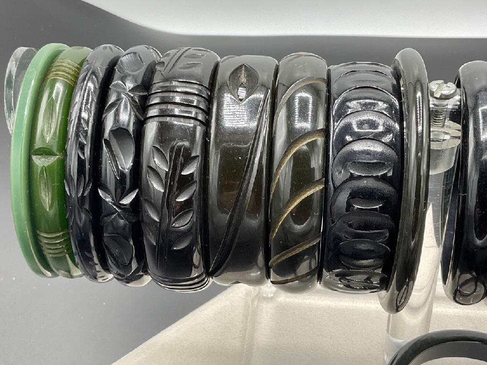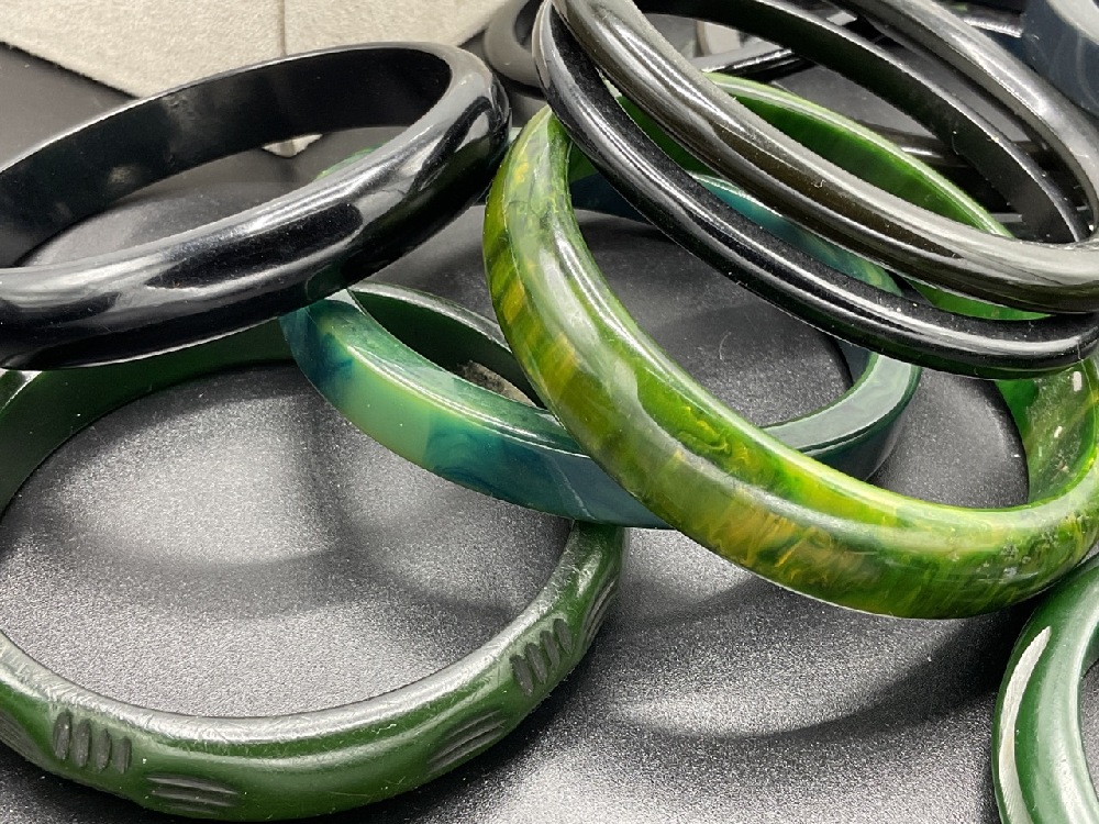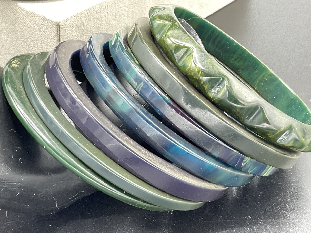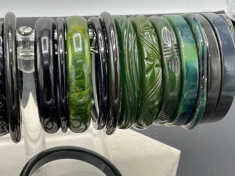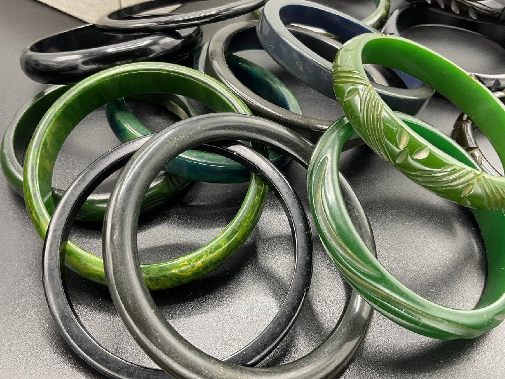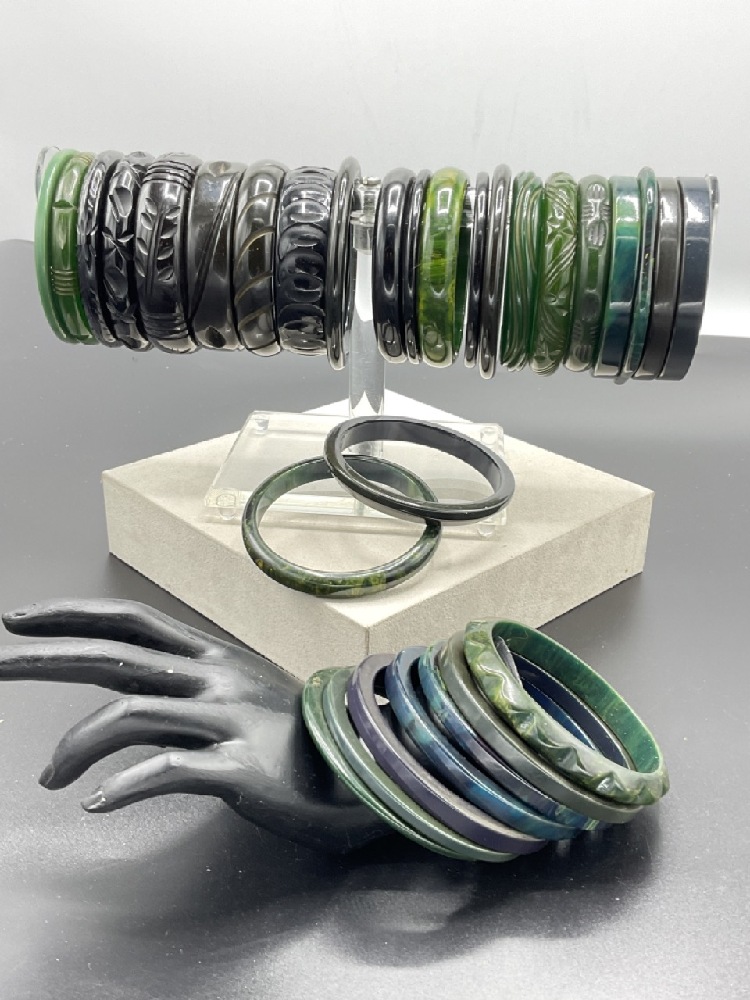 Thirly (30) Vintage Bakelite Bangle Bracelets. Many greens, green blues, carved, geoemetric etc. As seen in photograph preview.