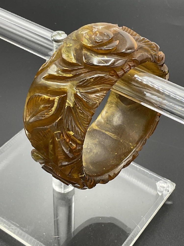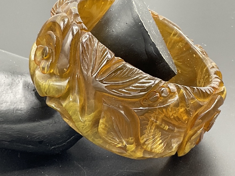 Carved two tone apple juice Bakelite and green bangle bracelet.