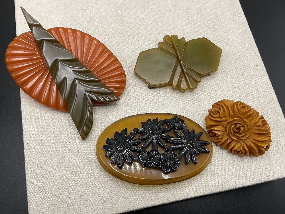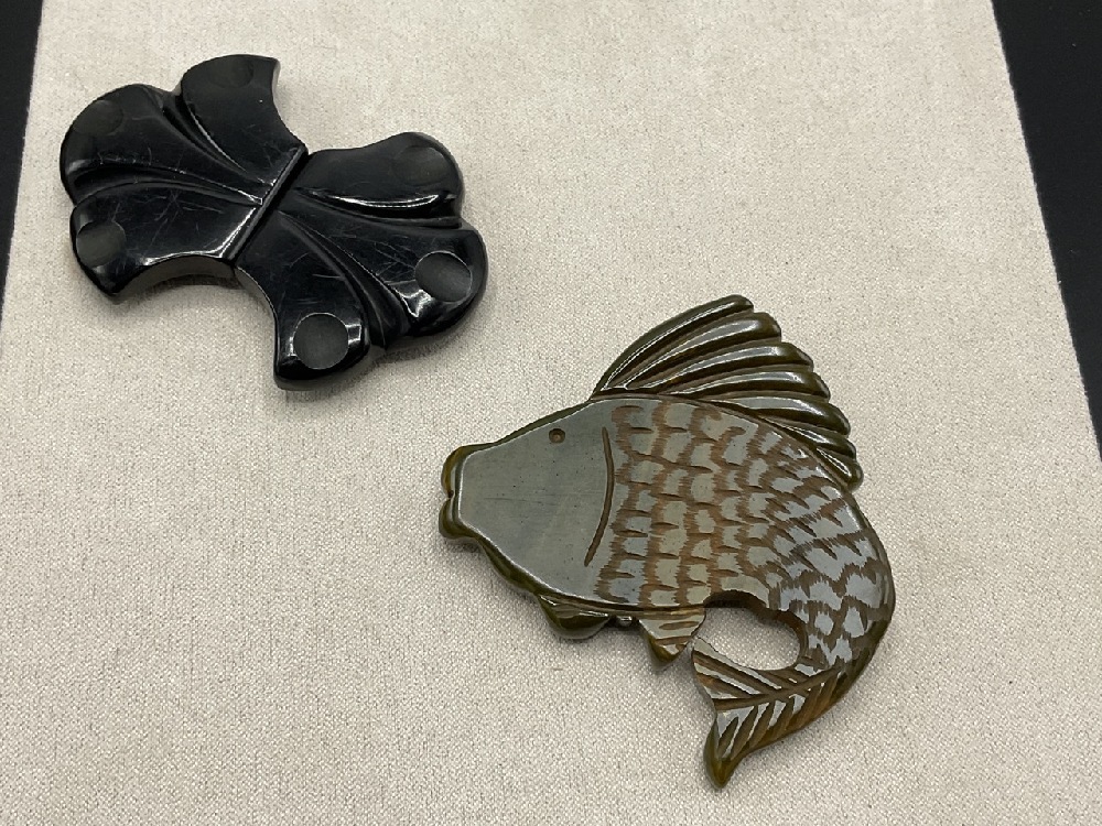 Ten (10) Bakelite Pins, Earrings, Buckles and Clips. Carved nuts, fish, wood and butterscotch Geometric earrings. As seen in photograph preview.