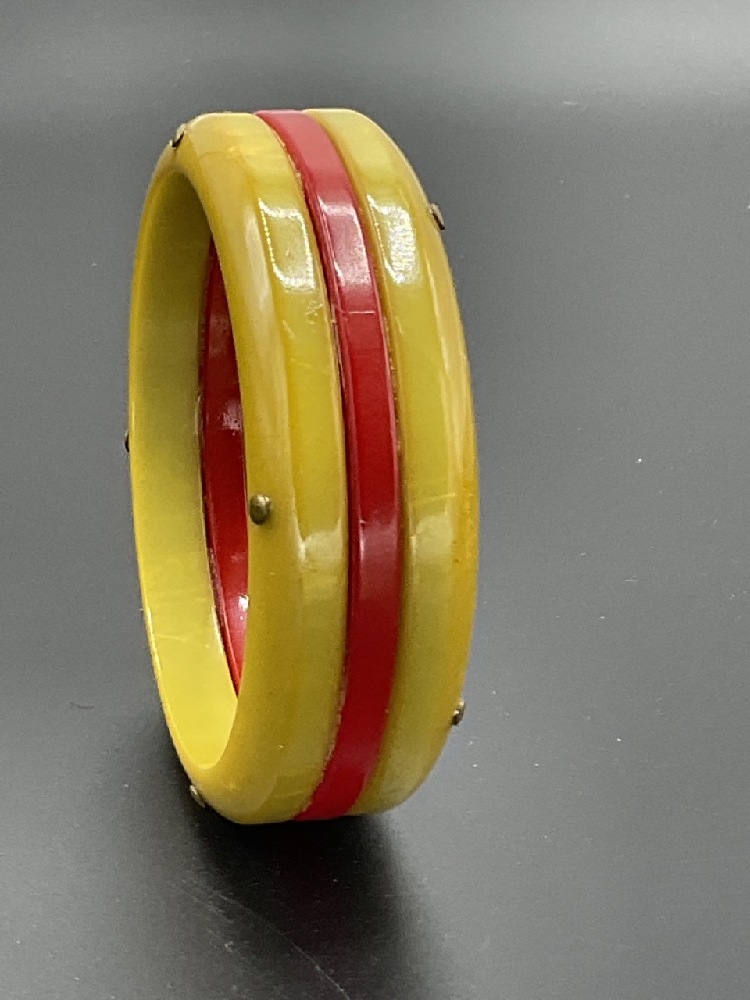 An Olive green and red Bakelite stacked and pinned bangle bracelet.