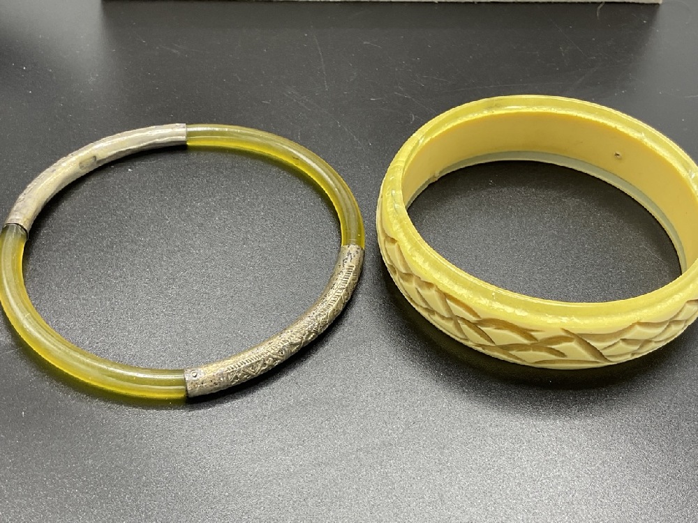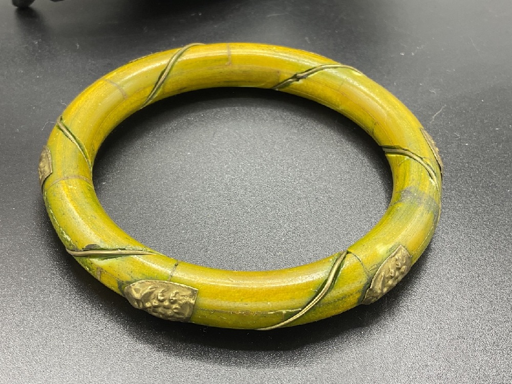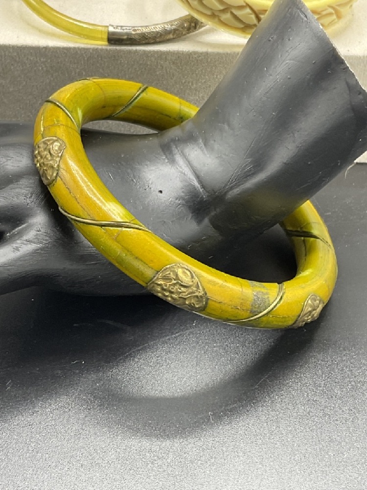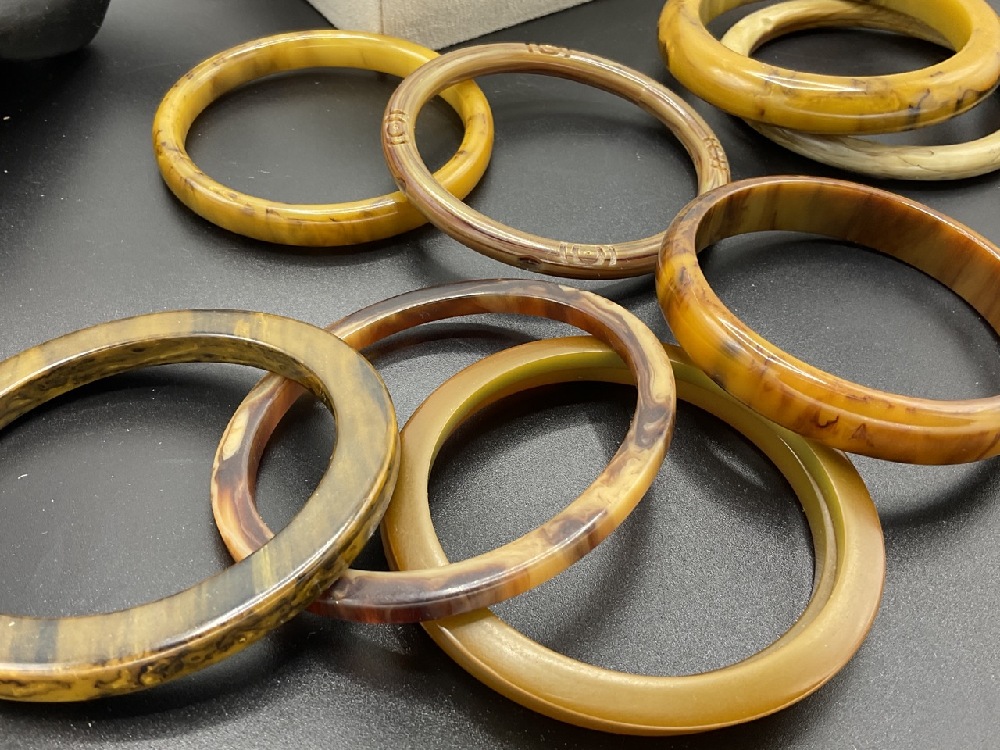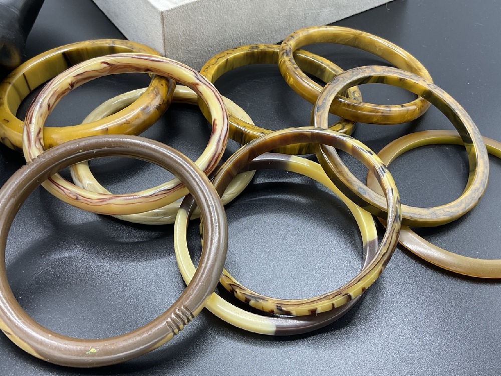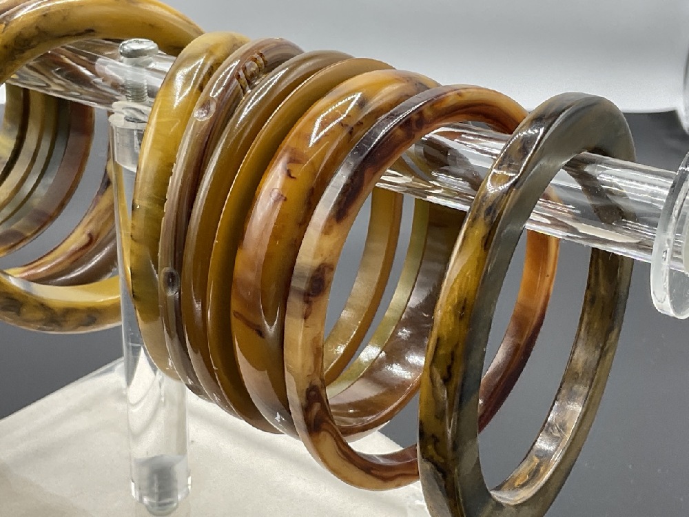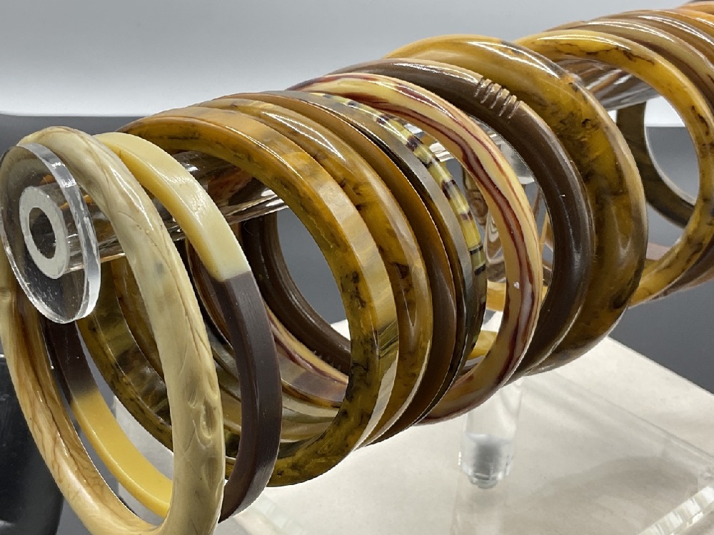 Twenty (20) Vintage Bakelite Bangle Bracelets. Caramel swirl, greens, applied metal, laminate, tortoise. As seen in photograph preview.