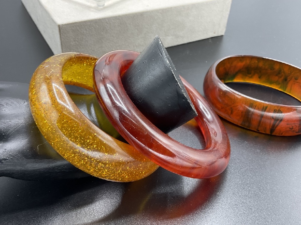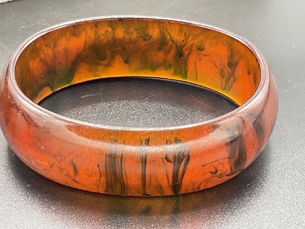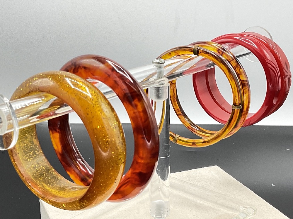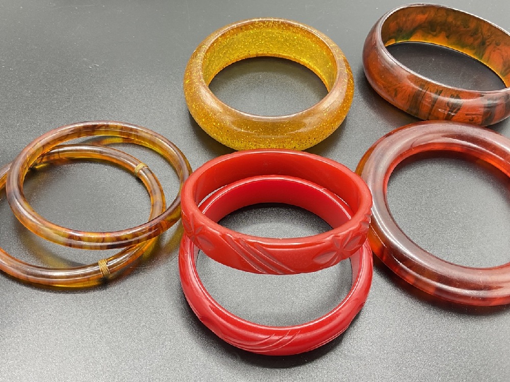 Seven (7) Vintage Bakelite Bangle Bracelets. Tortoise, speckled apple juice, cherry red etc.