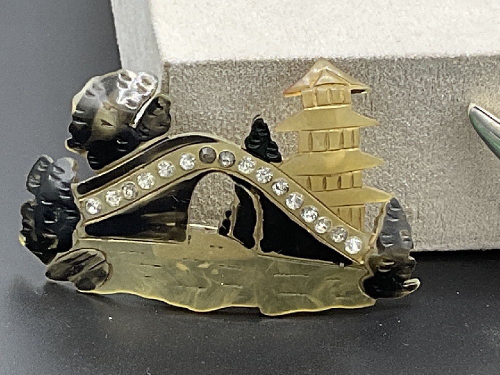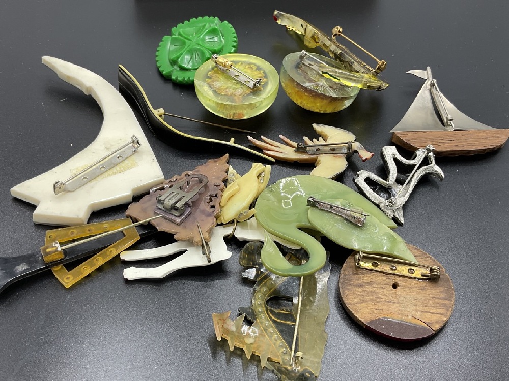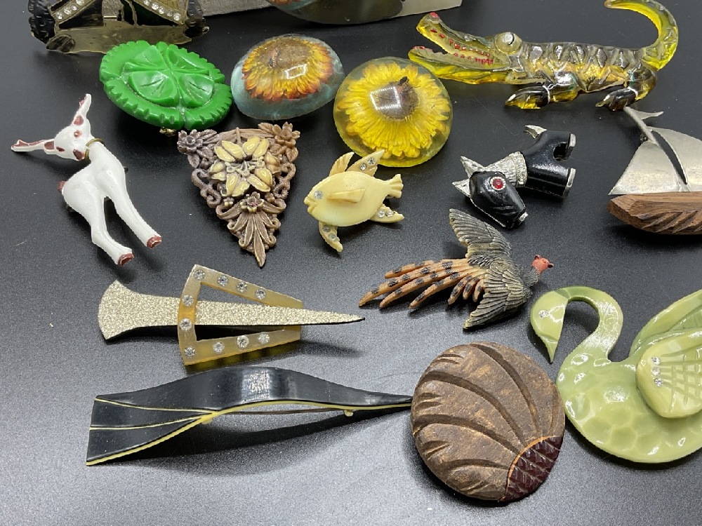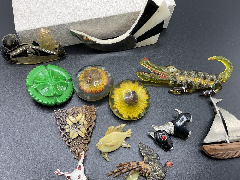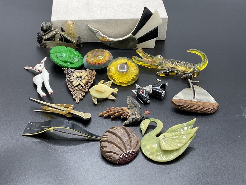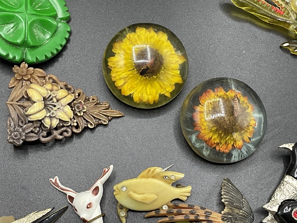 Sixteen (16) assorted lucite, Bakelite and vintage plastic figural pins. As seen in photograph preview. Lucite sunflower bug pin and button, swan, deer, alligator etc.