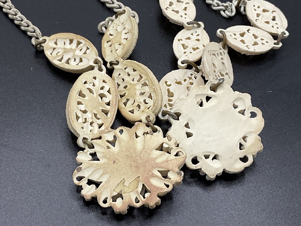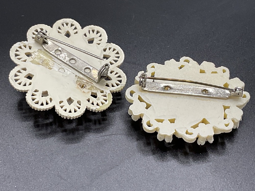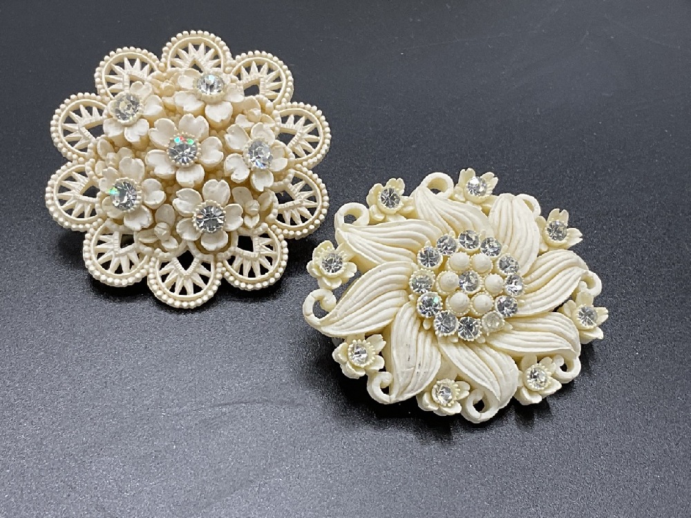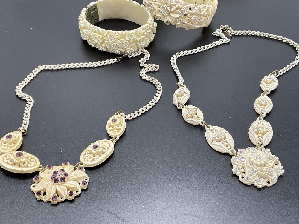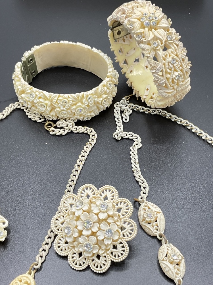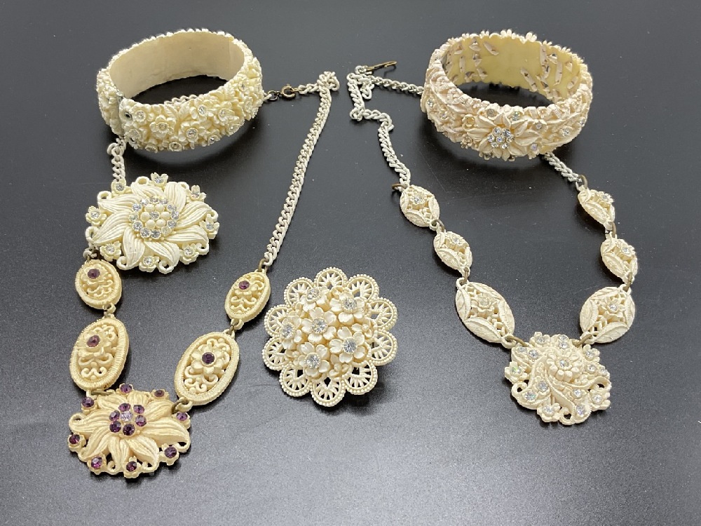 Six (6) Carved Celluloid Rhinetsone Jewelry Pieces. Two clamper bracelets, two brooches and two neckaces. As seen in photograph preview.