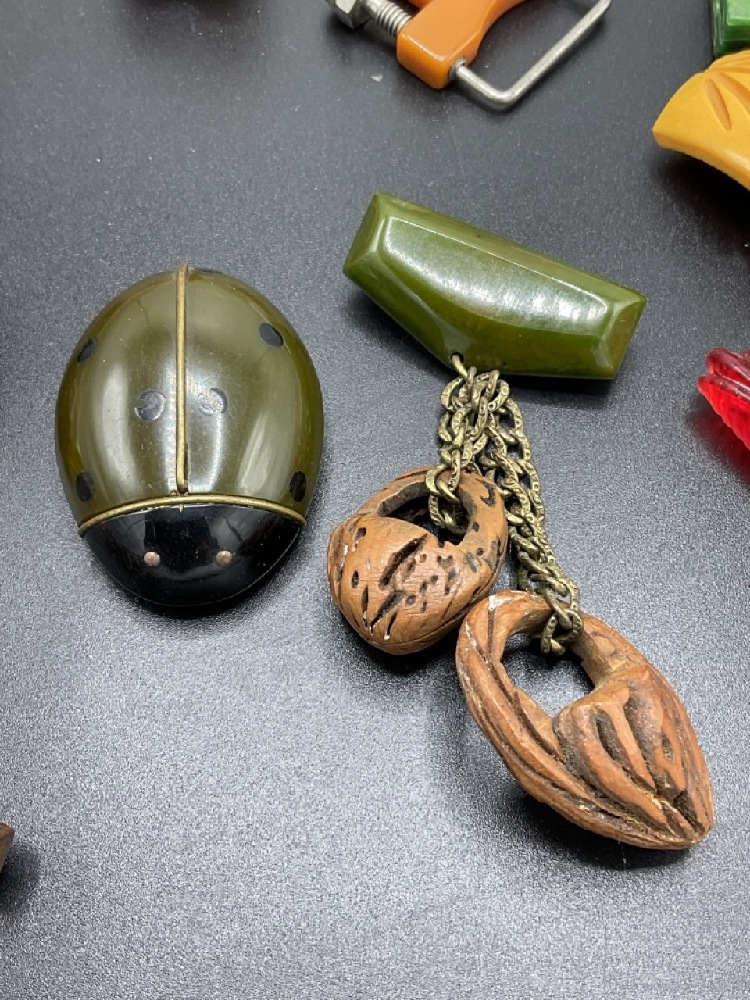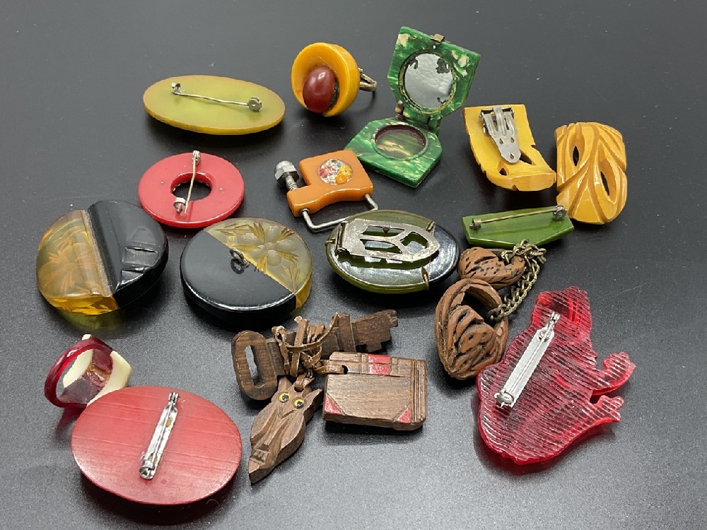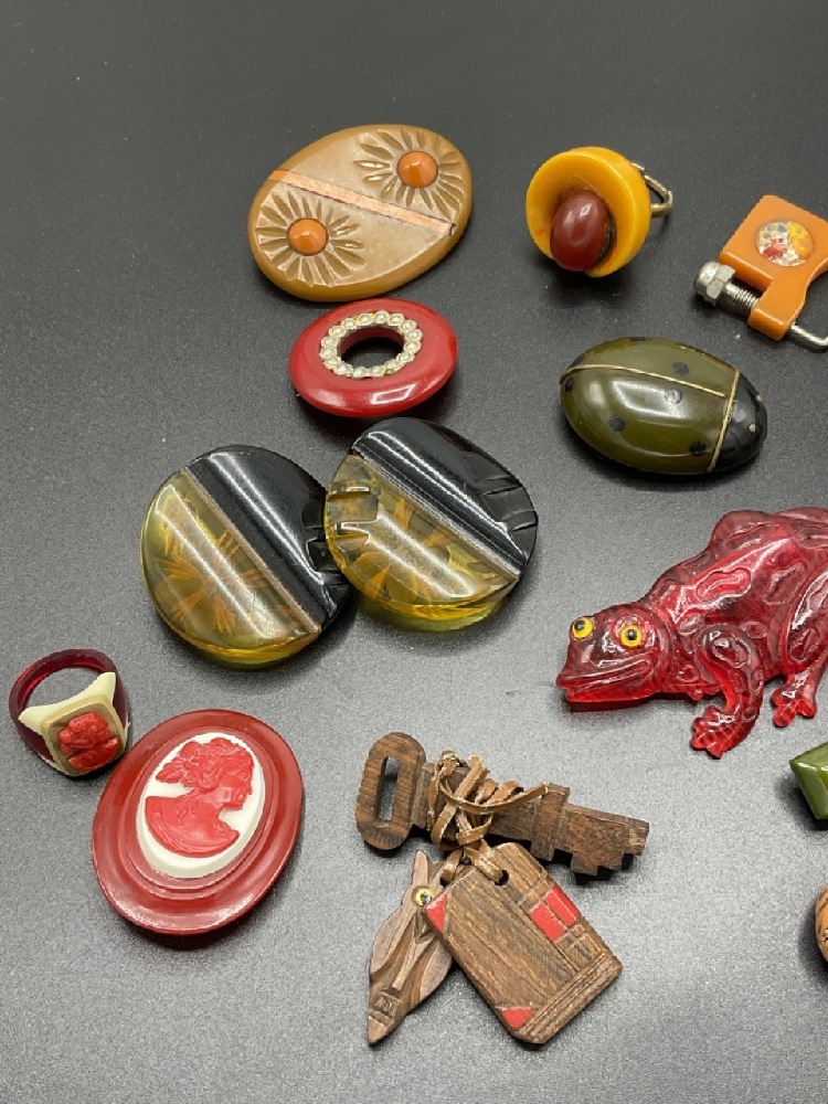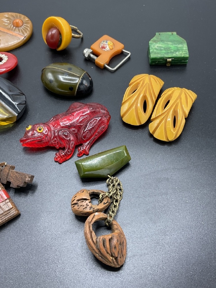 Fifteen (15) piece Lucite, Bakelite and carved wood jewelry. pins, Bakelite lip rouge, reverse carved buttons, clips, walnut baskets, lucite frog, Cameo and cameo ring (Bakelite). As seen in photograph preview.