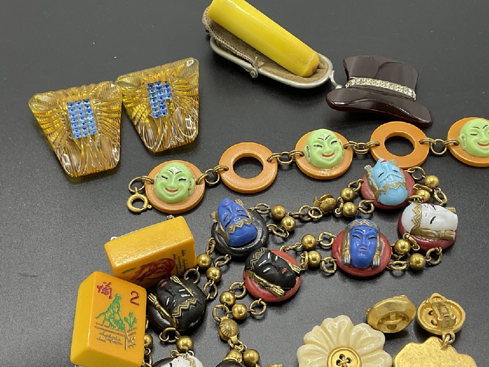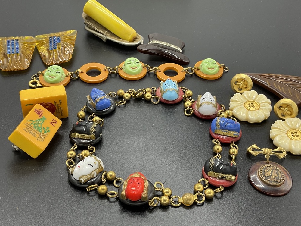 Compiled vintage plastic jewelry, reverse carved Bakelite clips (a few blue rhinestones missing) , top hat pin, mahjong pins, Buddha face bracelet, painted faces neckace etc. As seen in photograph preview.