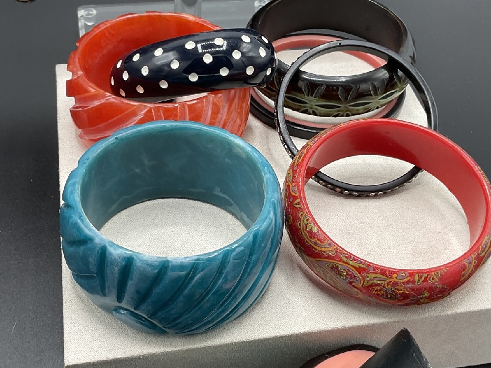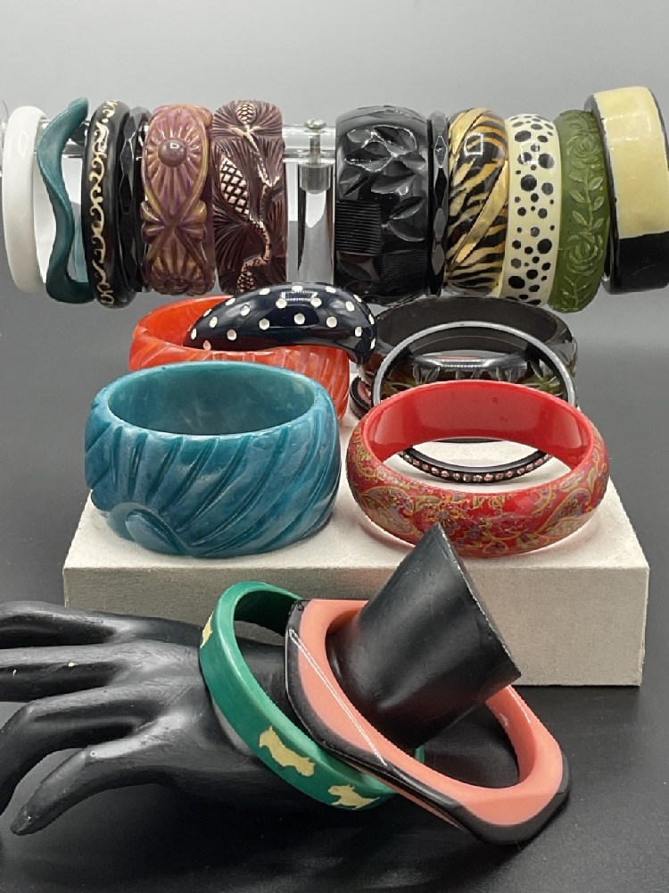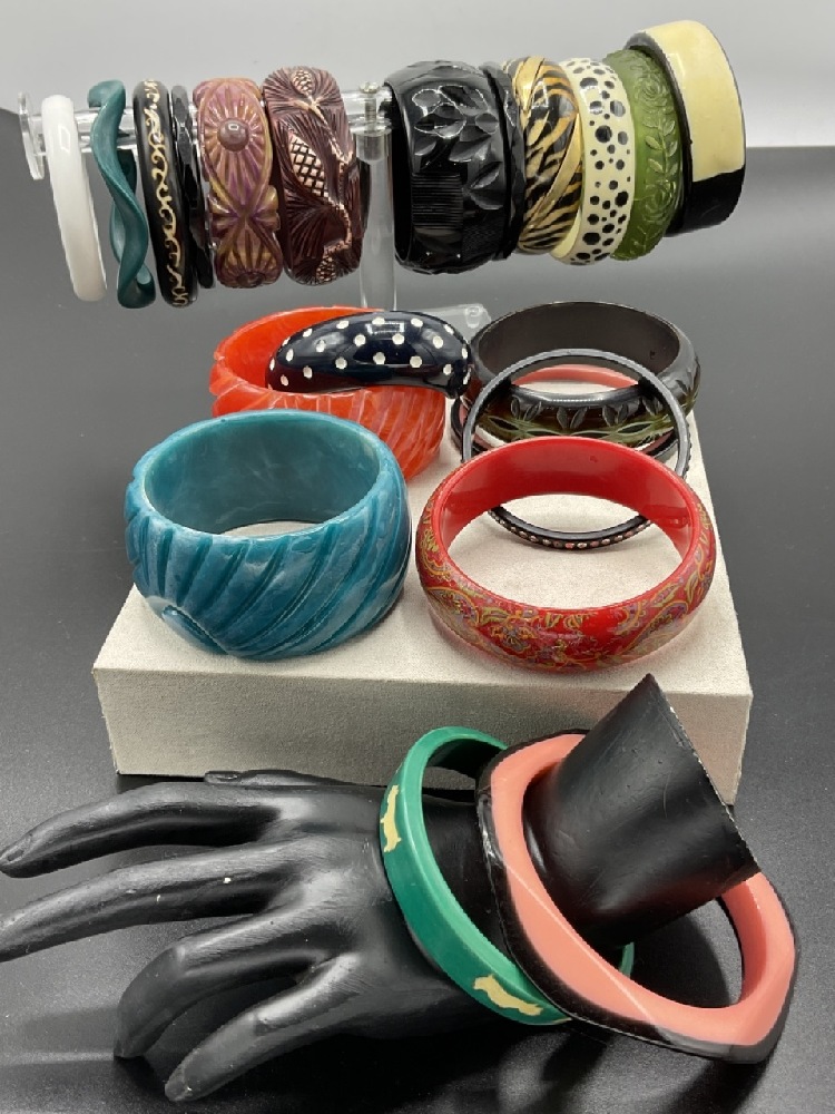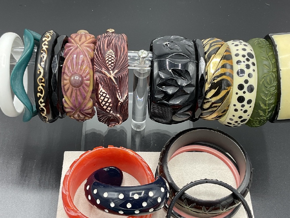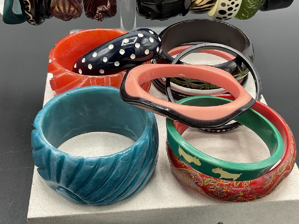 Twenty (20) vintage and contemporary plastic bangle bracelets. Not Bakelite.