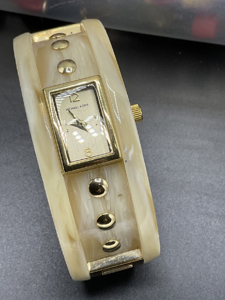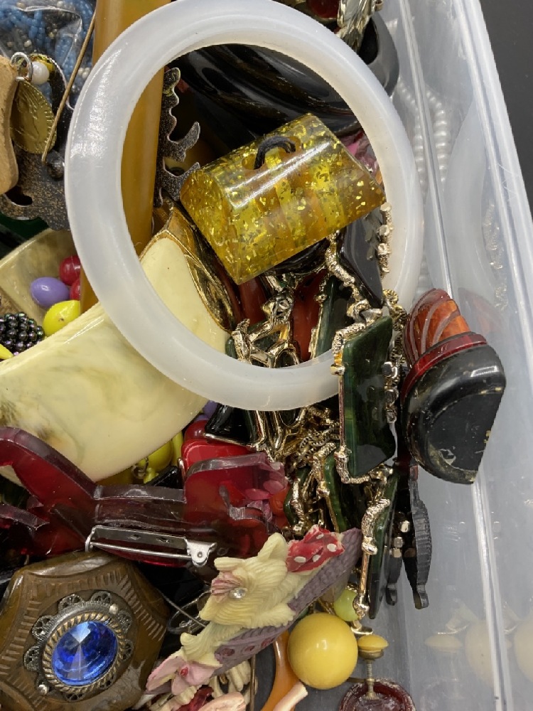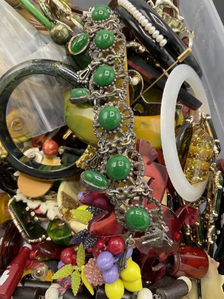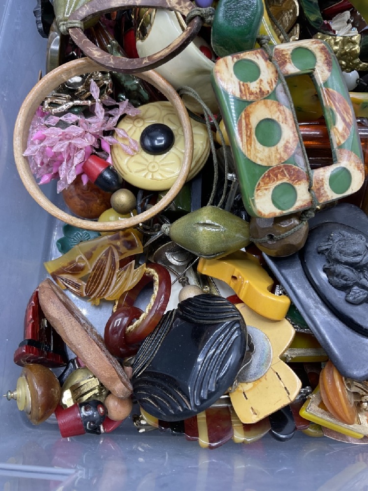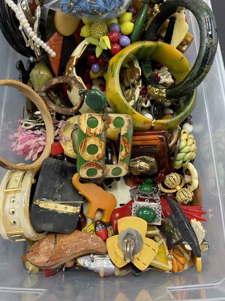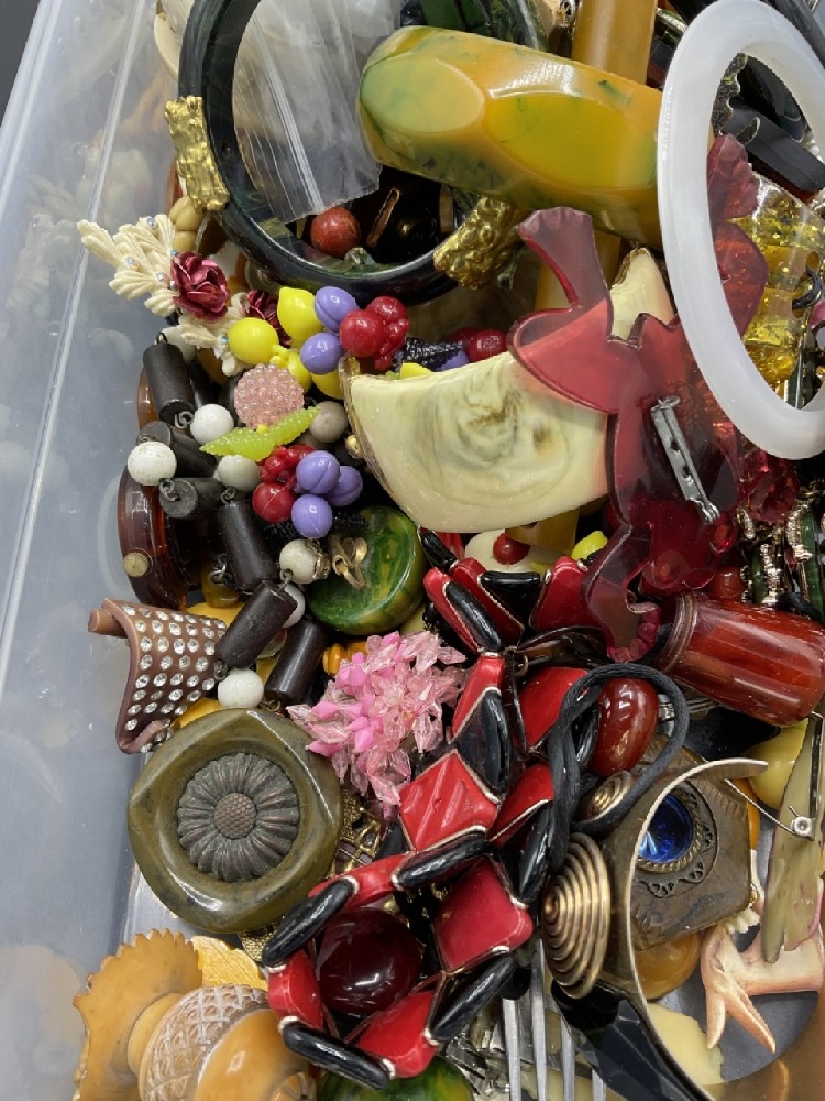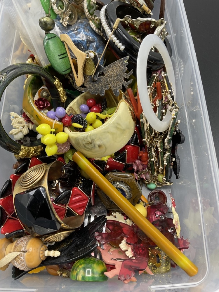 A large shoe box size plastic bin filled with costume and damaged Bakelite jewelry, contemporary pins, Michael Kors wristwatch and other parts or repair related pieces.