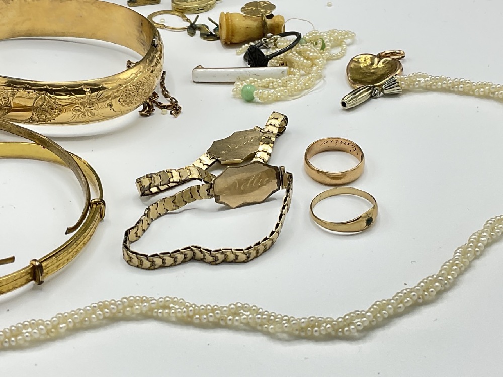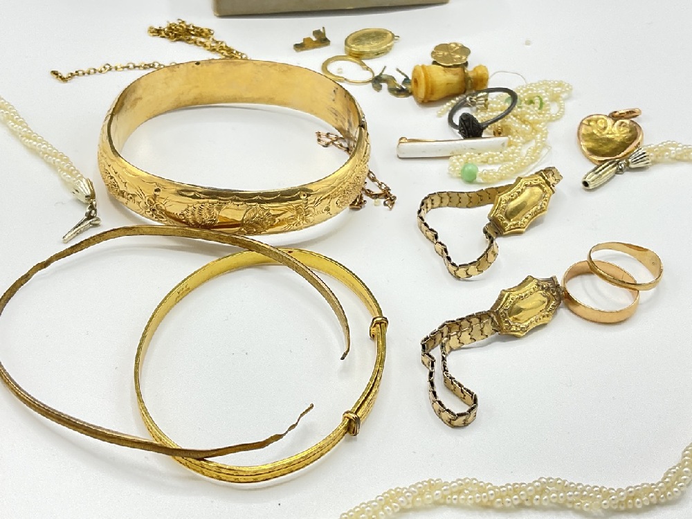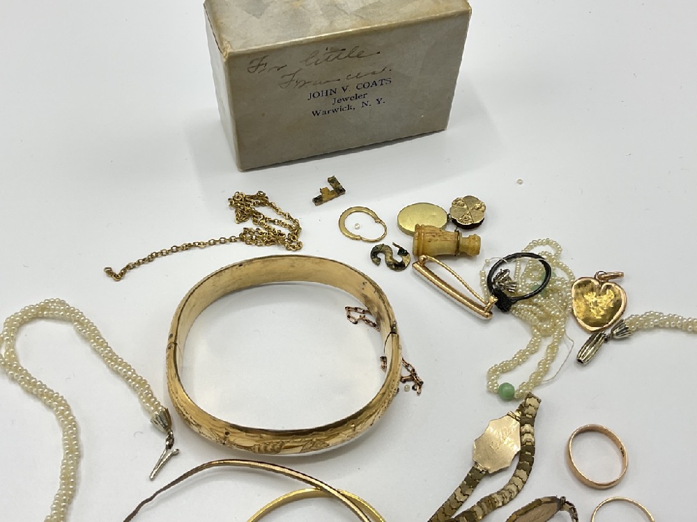 A grouping of child momentos. Warwick New York jewelers box with baby and toddler jewelry. 14k baby ring, 14k gold locket, 10k gold ring etc.