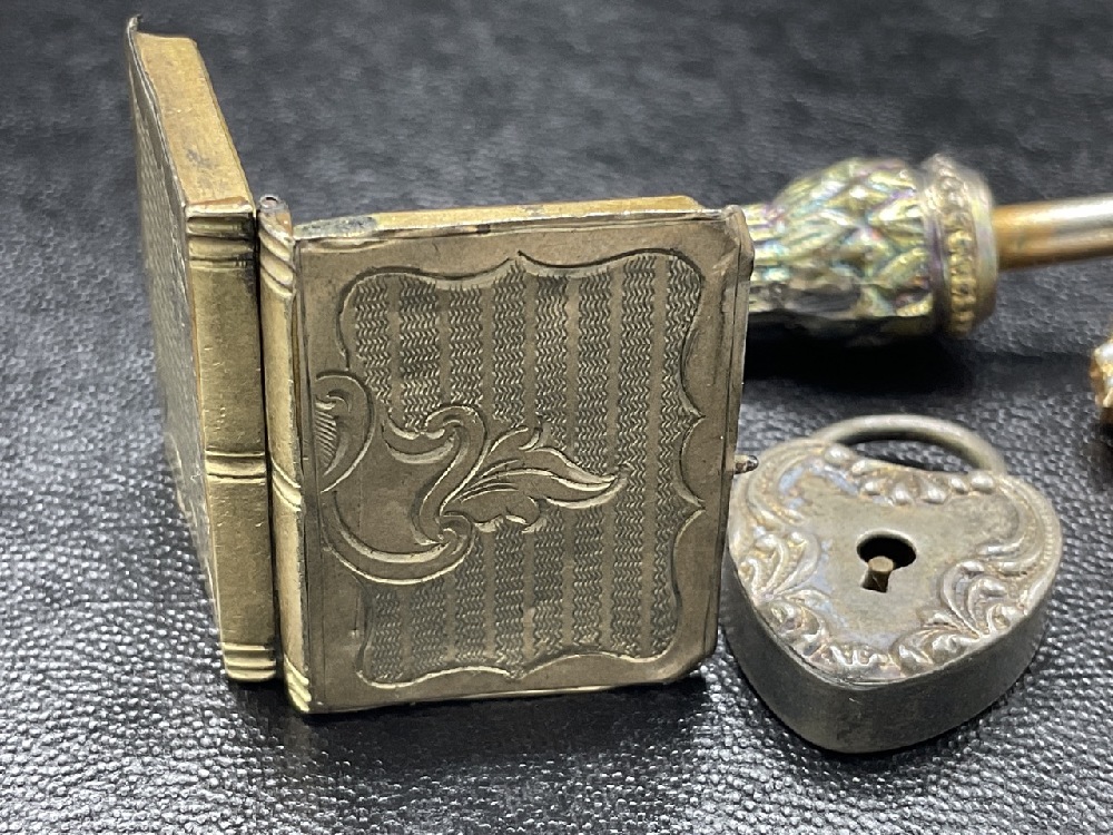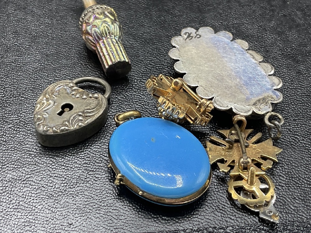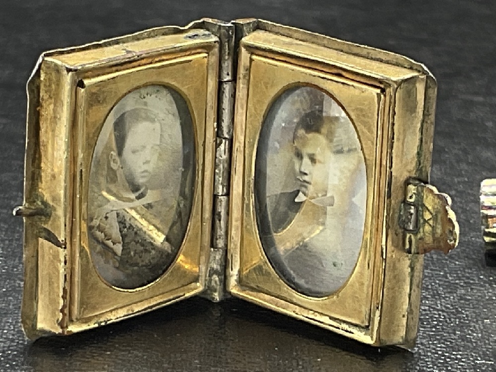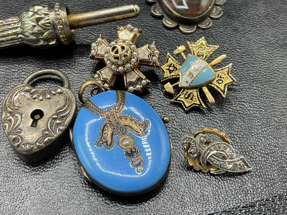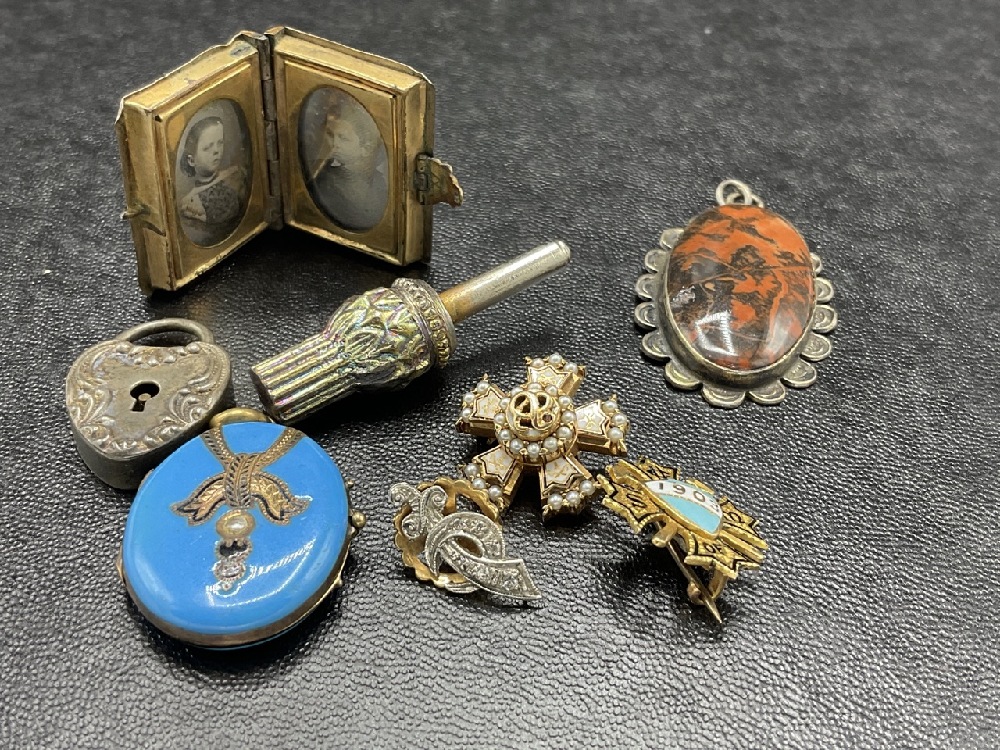 A small box of estate found Victorian era jewelry pieces. Early miniature daguerreotype locket, 14k gold pins, French blue enameled locket etc. As seen in photograph preview.