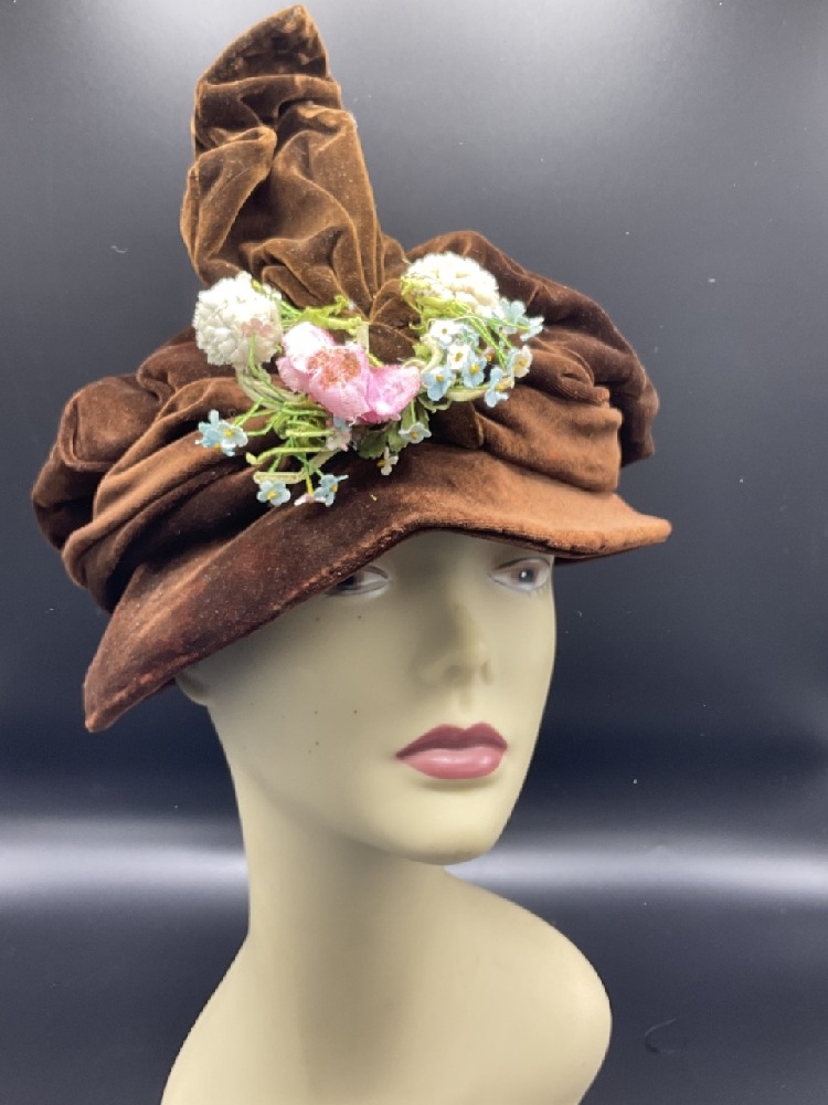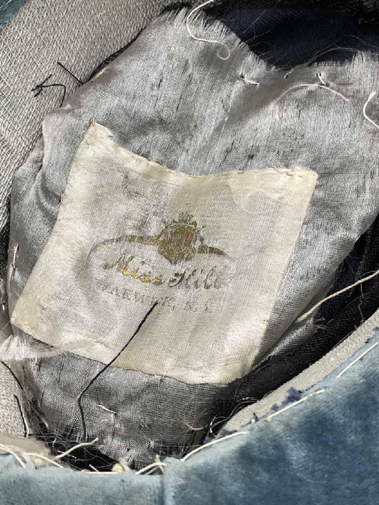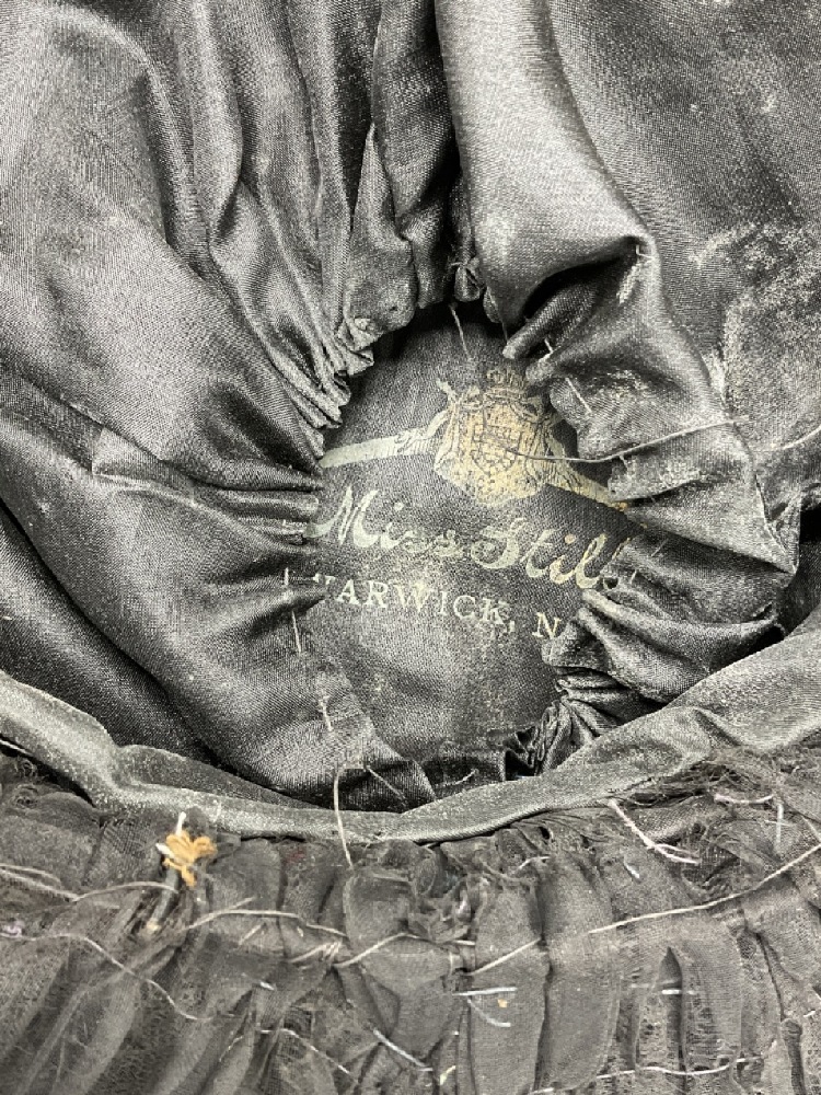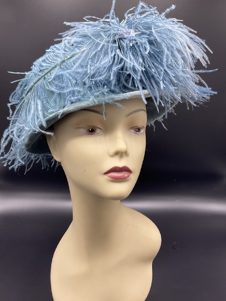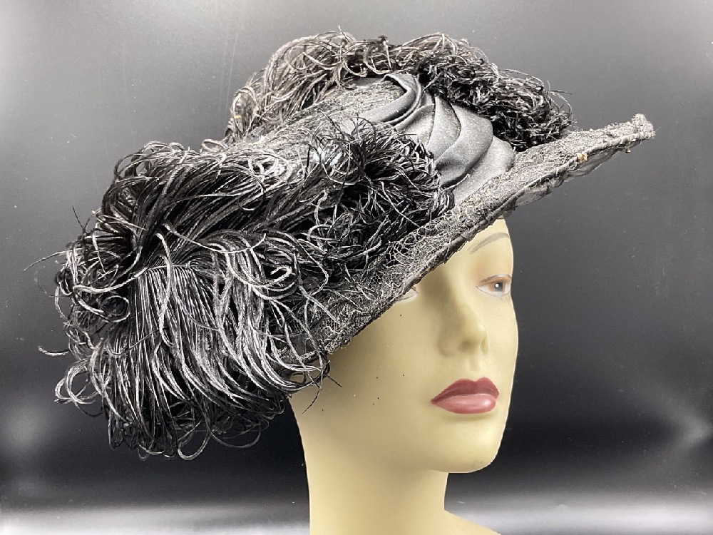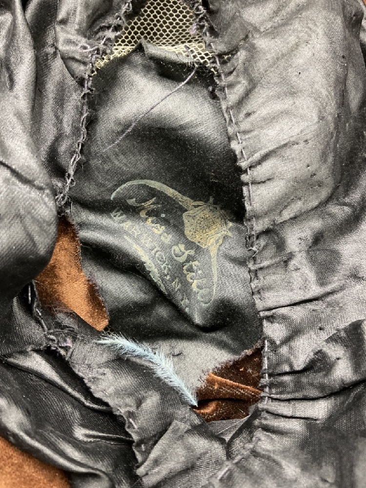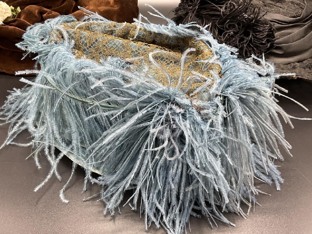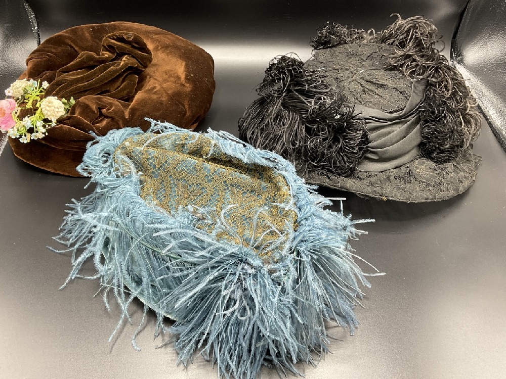 Black plum feather and lace hat brown velvet with flower appliqué and pale blue some feather with lace all signed by Miss Still, Warwick New York. Early 20th century.