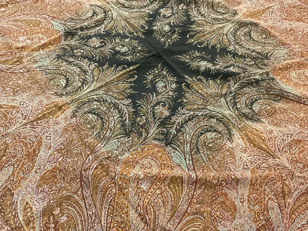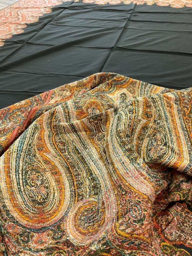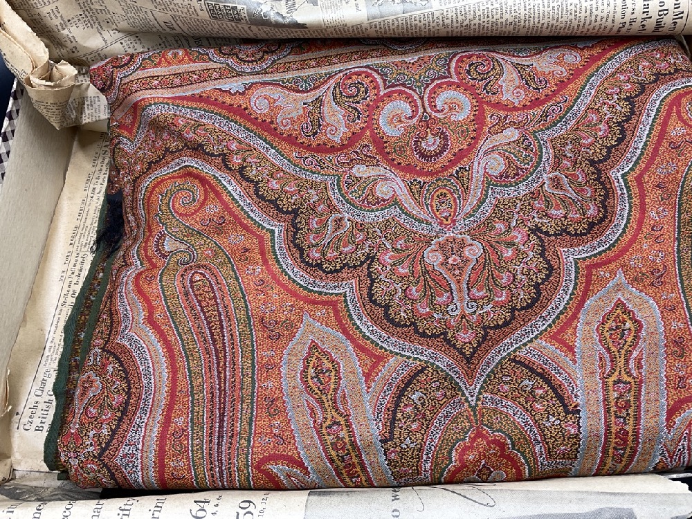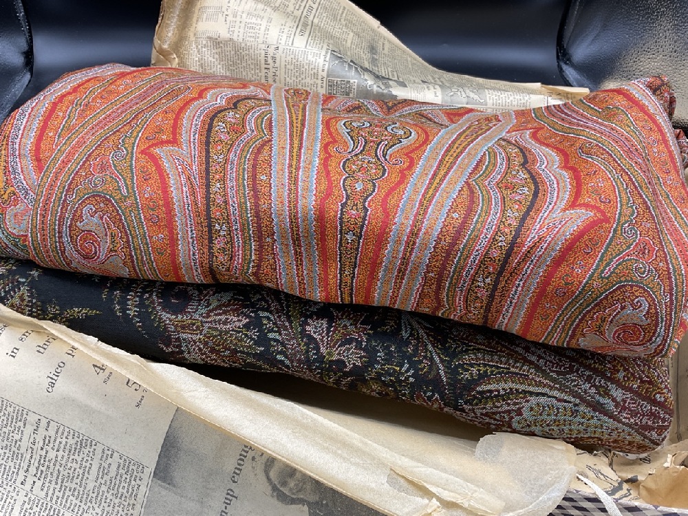 Two (2) Pristine Paisley print table cloths. One being a rectangular 10ft 8" X 5ft and a square 6ft table cloth. Early 20th century. Never used, very fine condition.