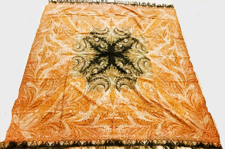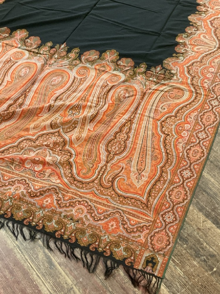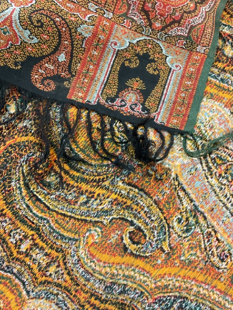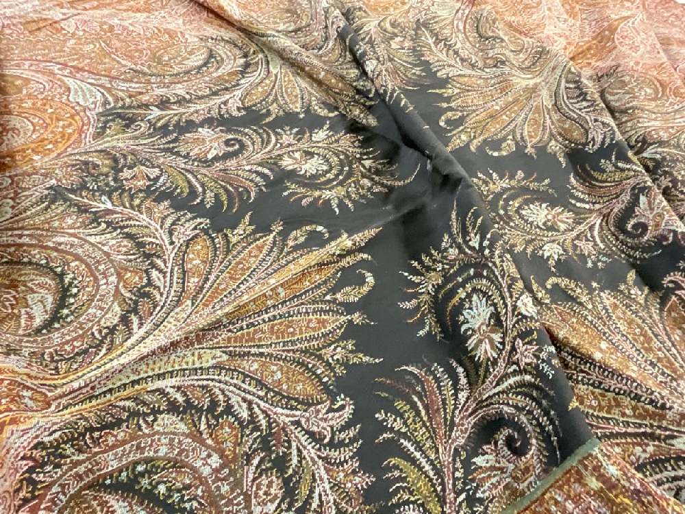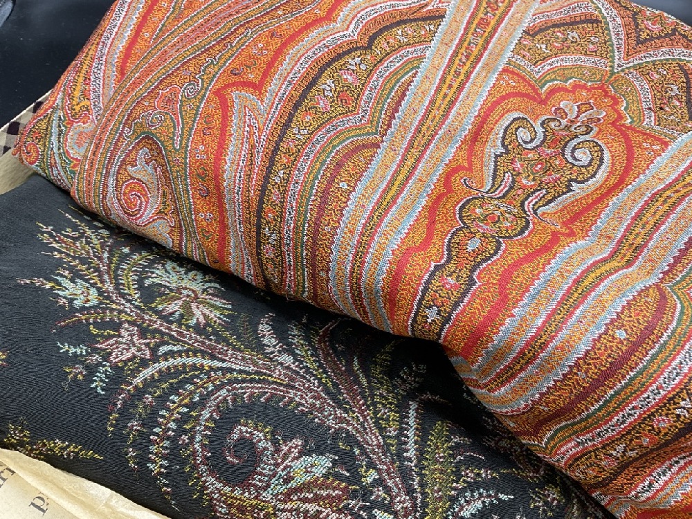 Two (2) Pristine Paisley print table cloths. One being a rectangular 10ft 8" X 5ft and a square 6ft table cloth. Early 20th century. Never used, very fine condition.