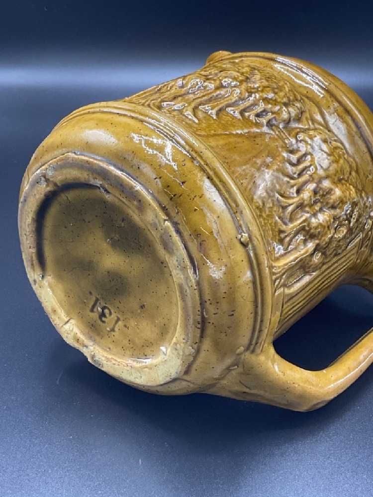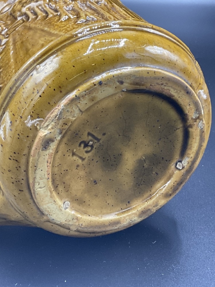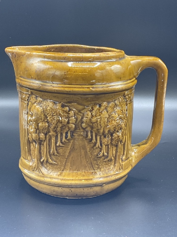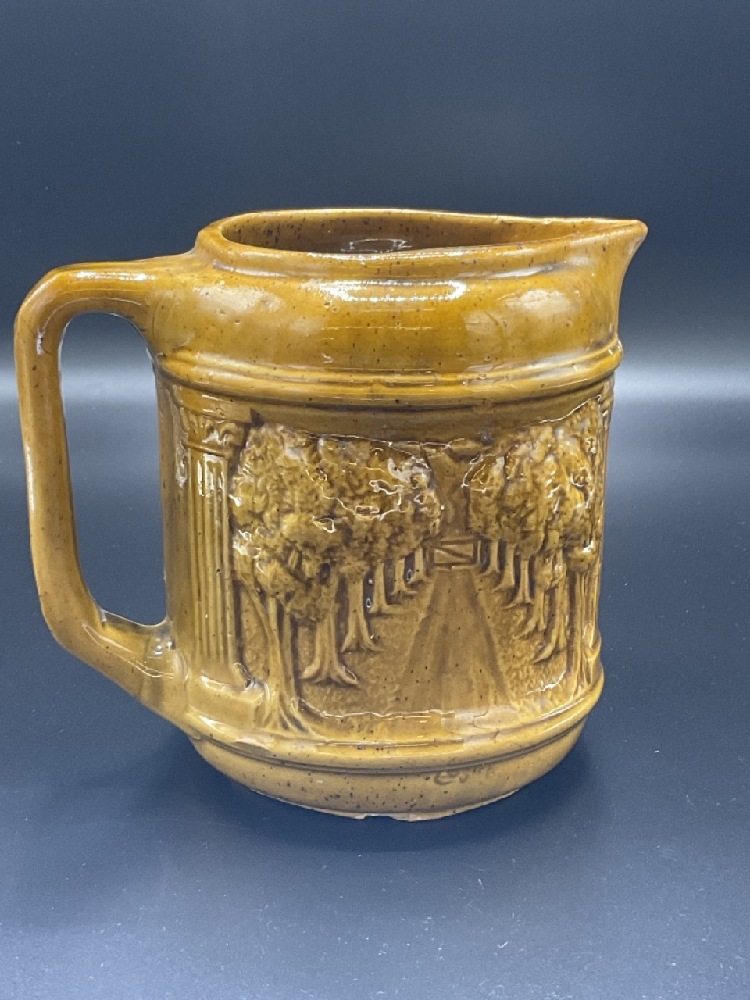 Mccoy Pottery Pitcher, Embossed tree line scene.