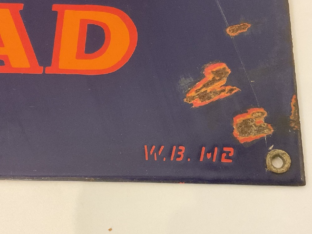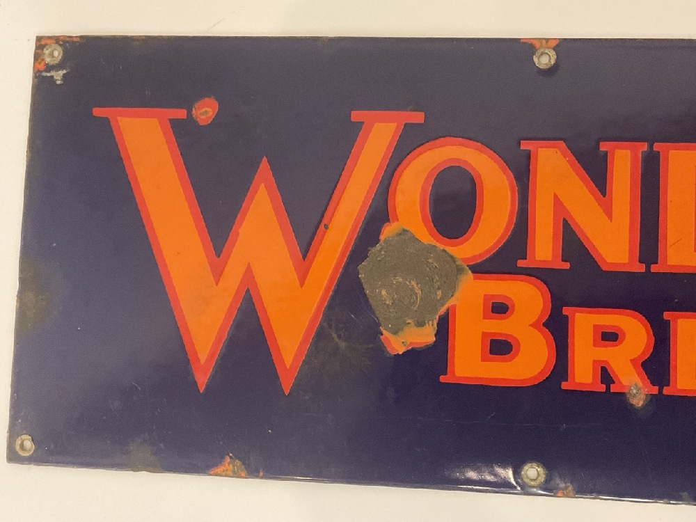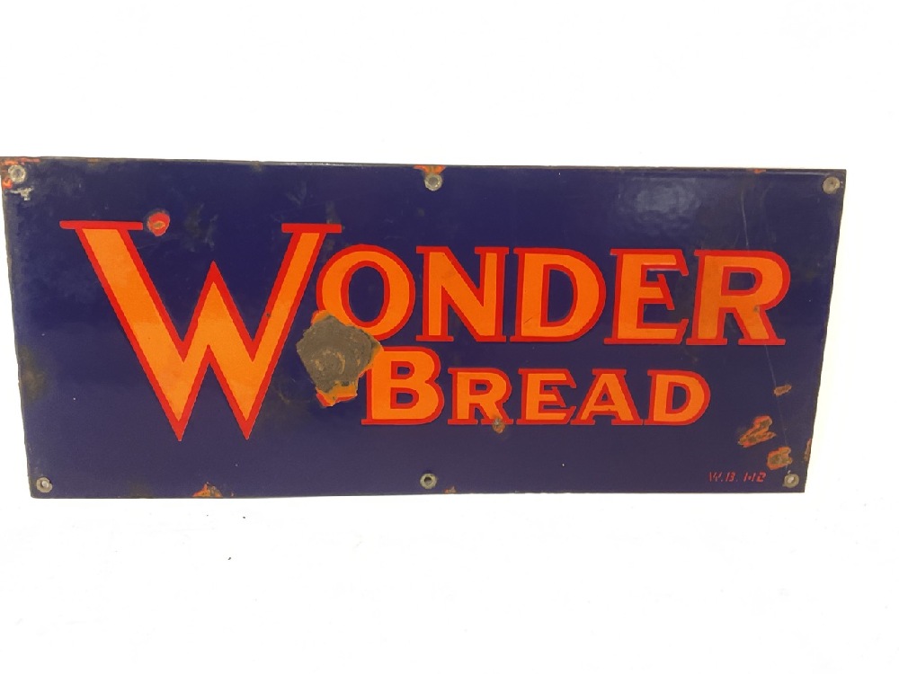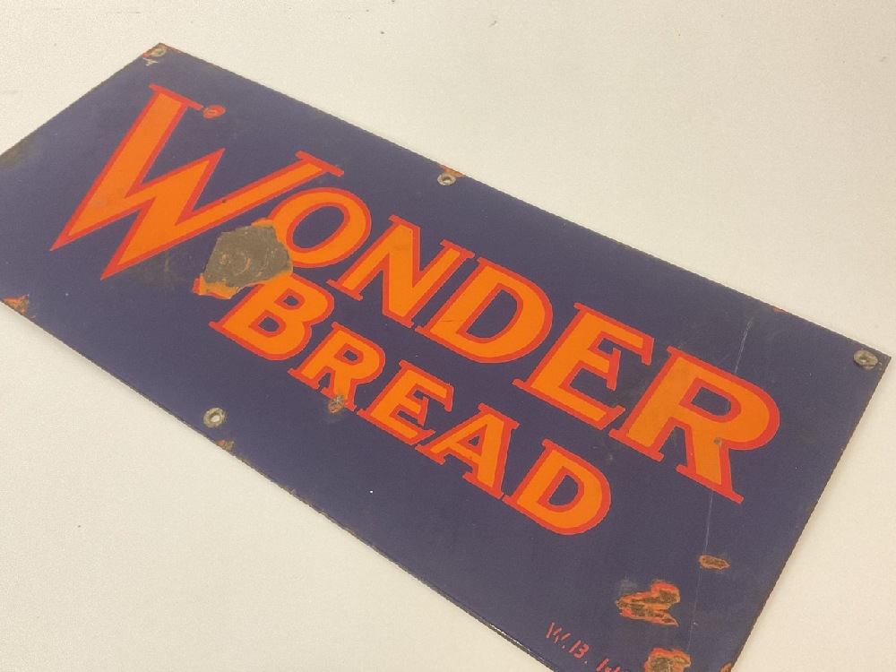 Vintage cobalt blue enameled and orange "Wonder Bread" advertising store sign.