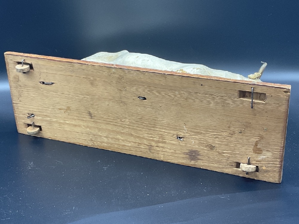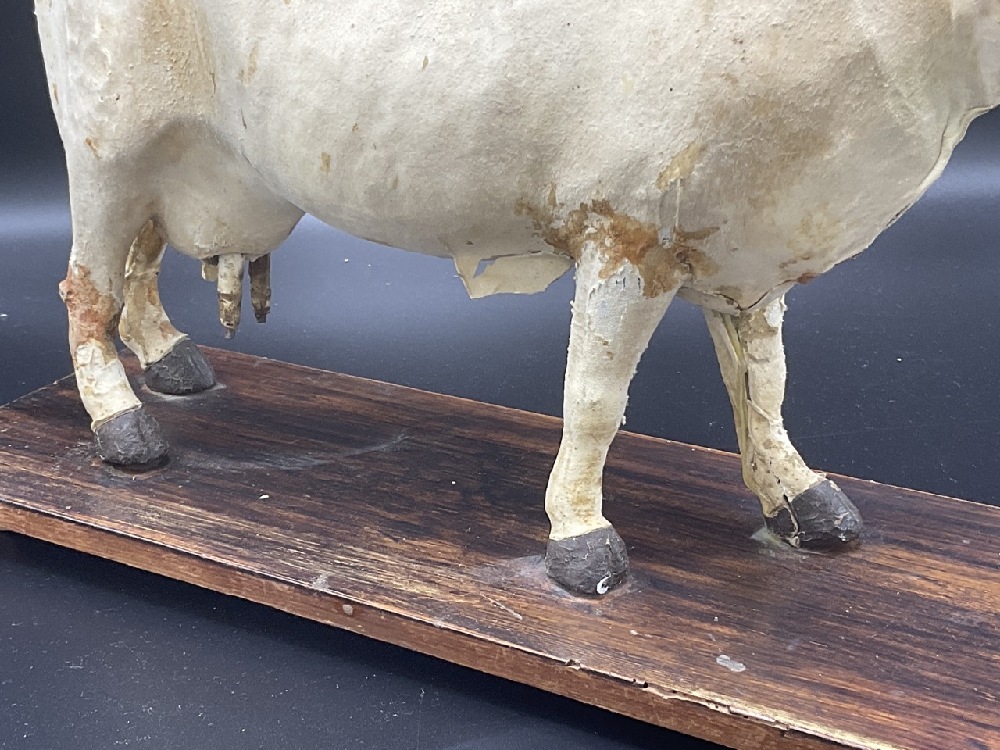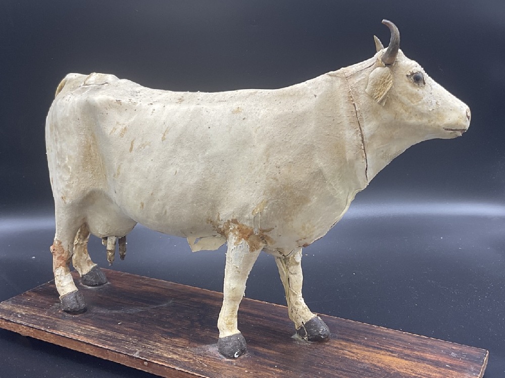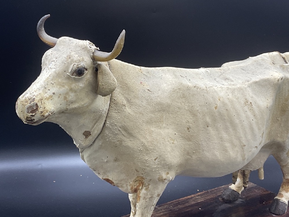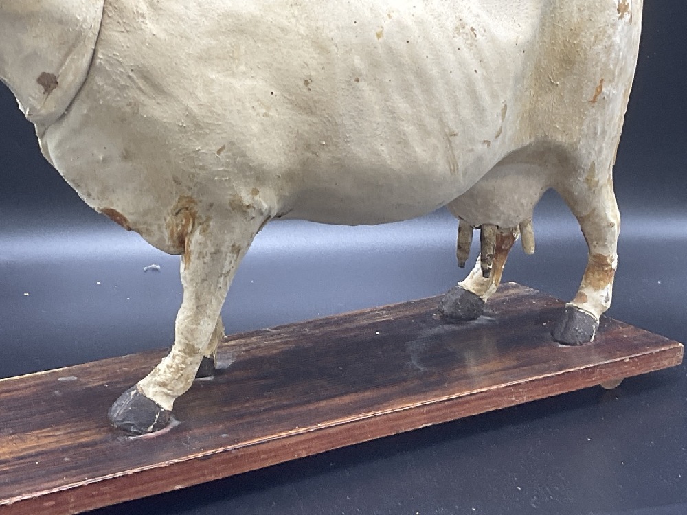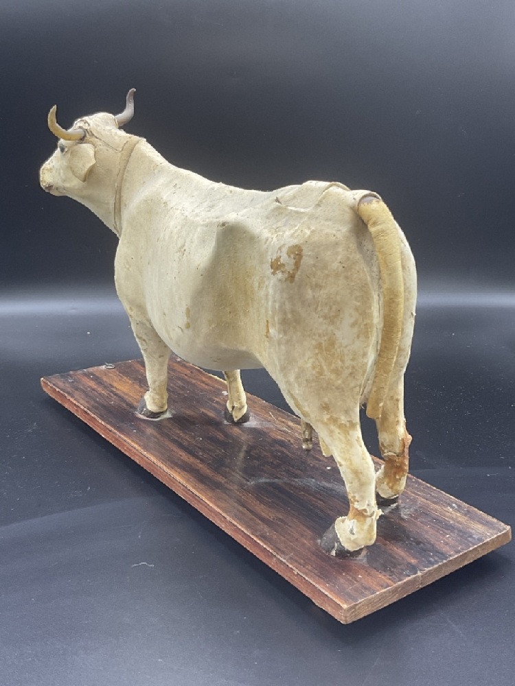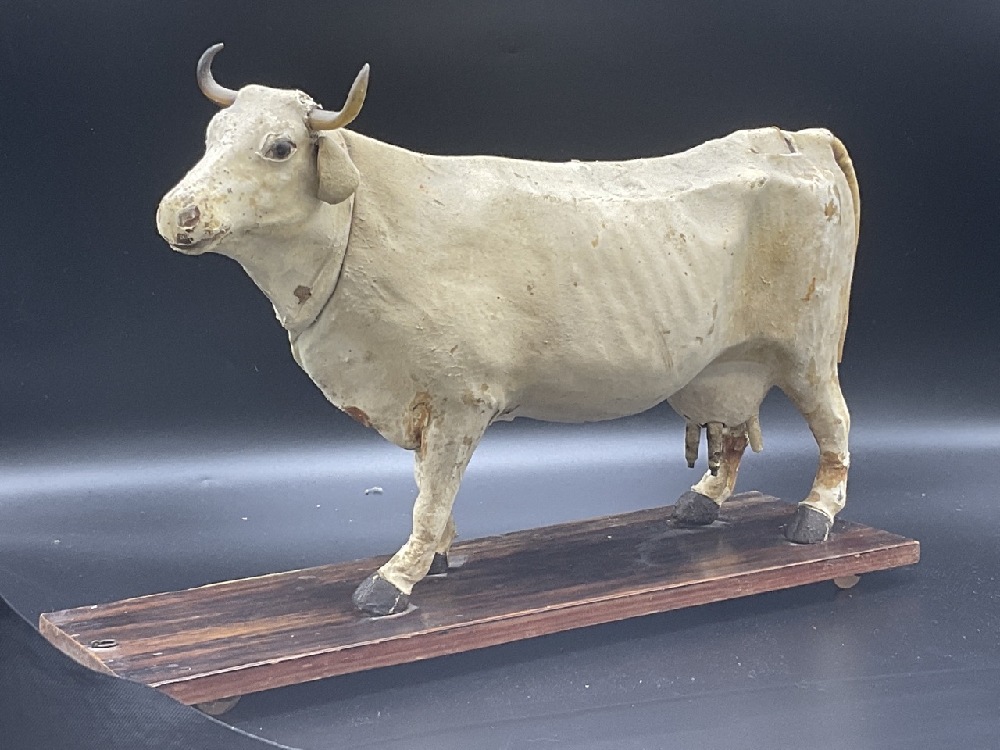 Antique Cattle Pull Toy w/ glass inset eyes. One wheel missing.