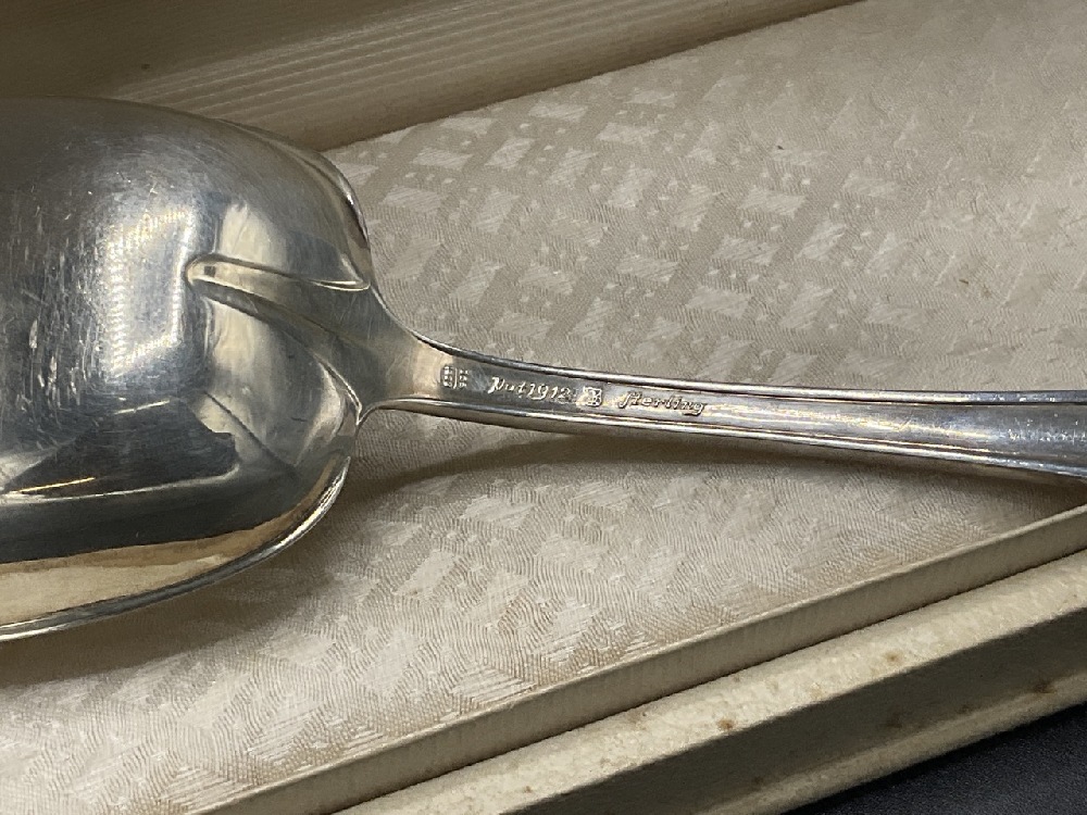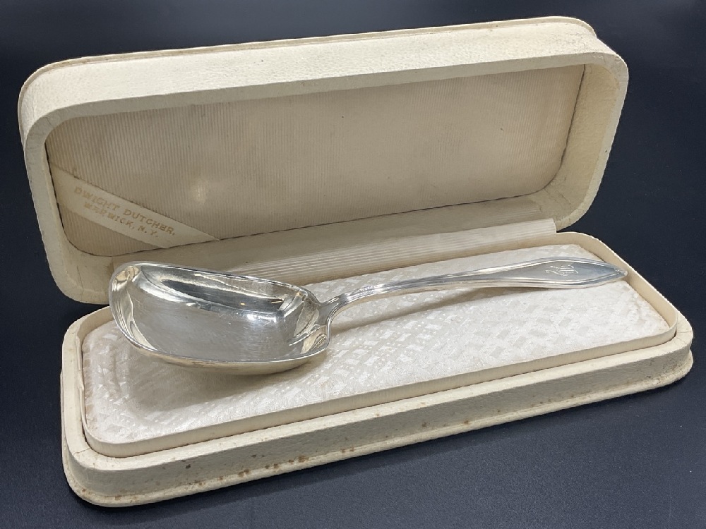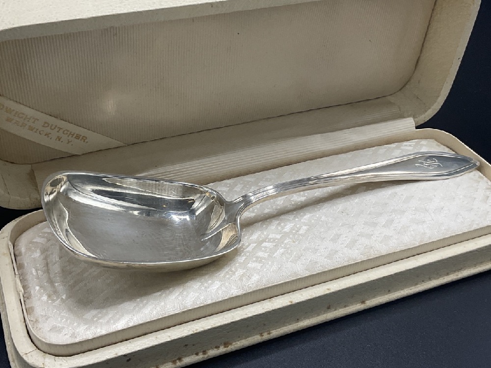Sterling Silver Serving Spoon with box from Dwight Dutcher, Warwick , NY. Towle sterling silver 1912 Patent.
