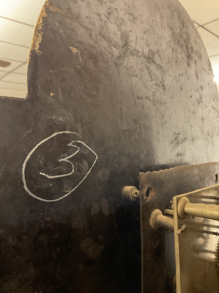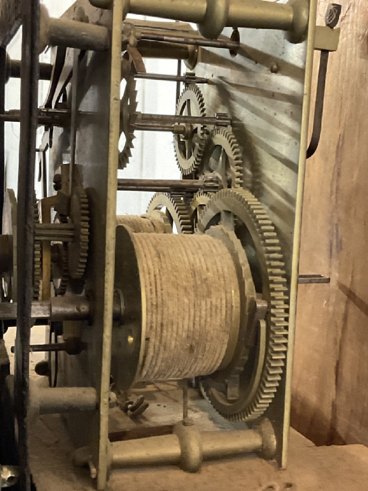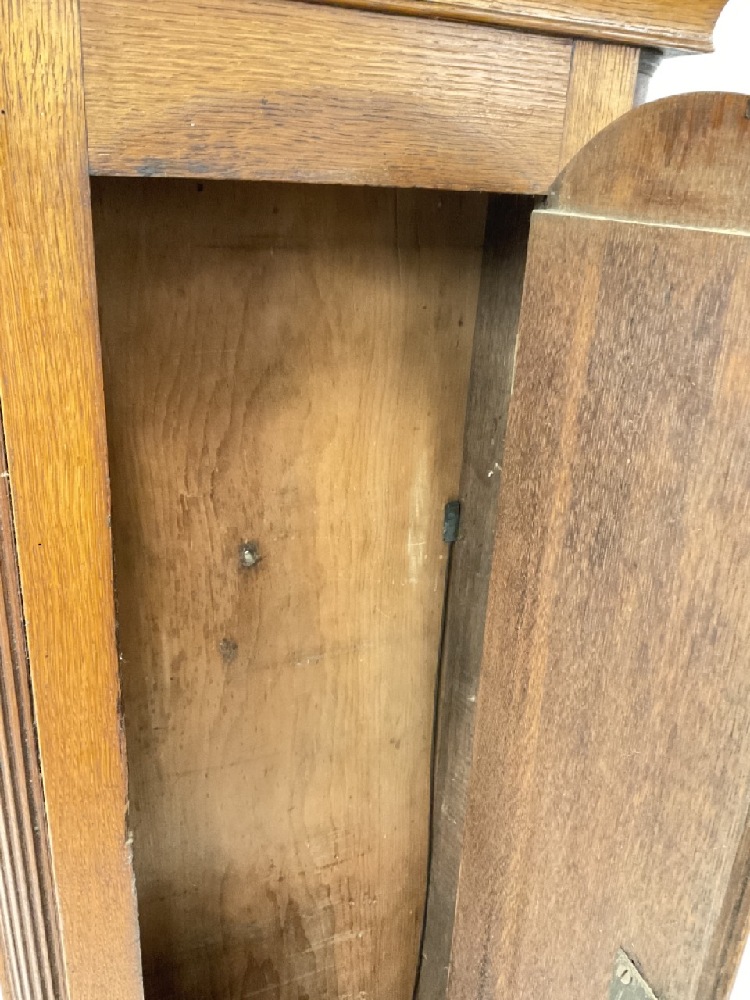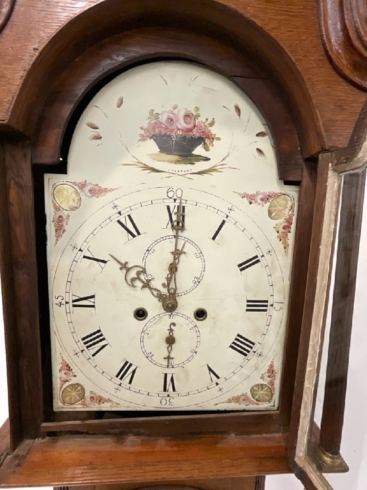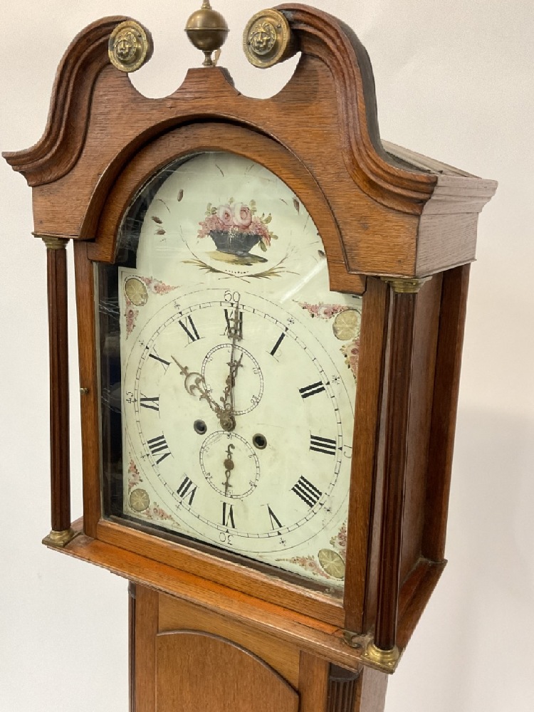 American Tall Case Clock. Oak Case. New England 19th century. Clock appearing to have all working movements and pendulum.