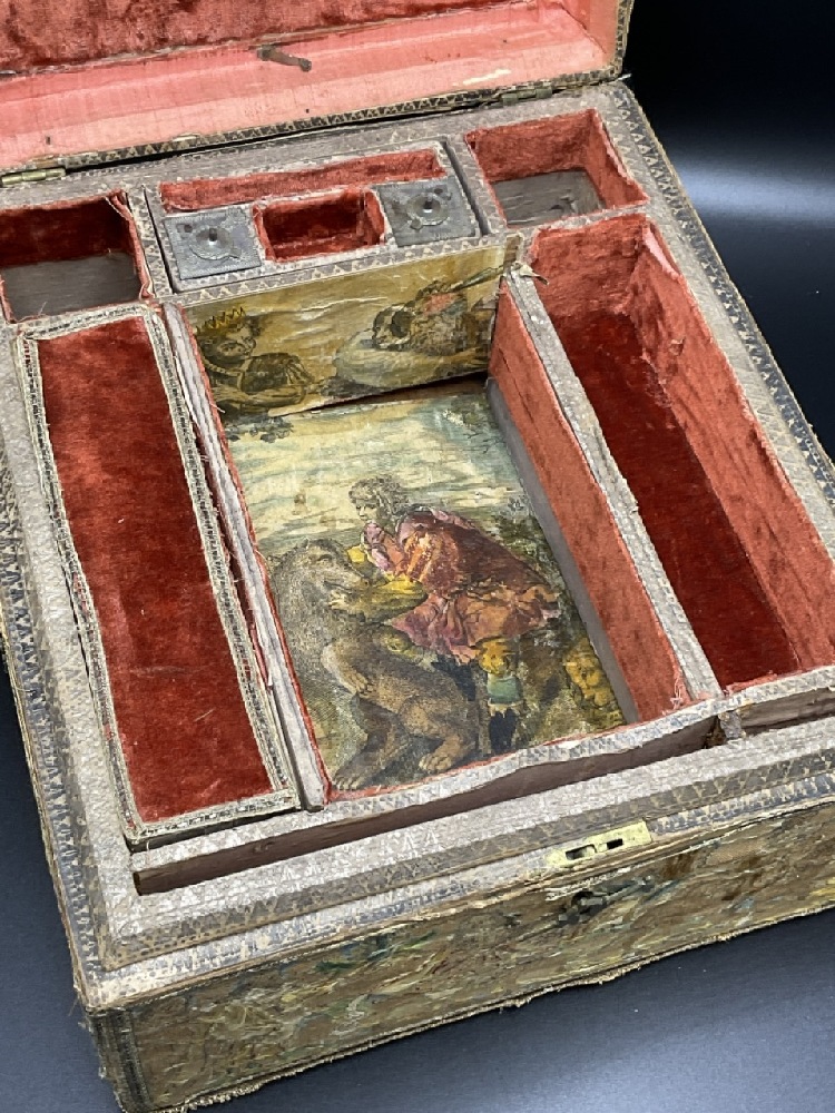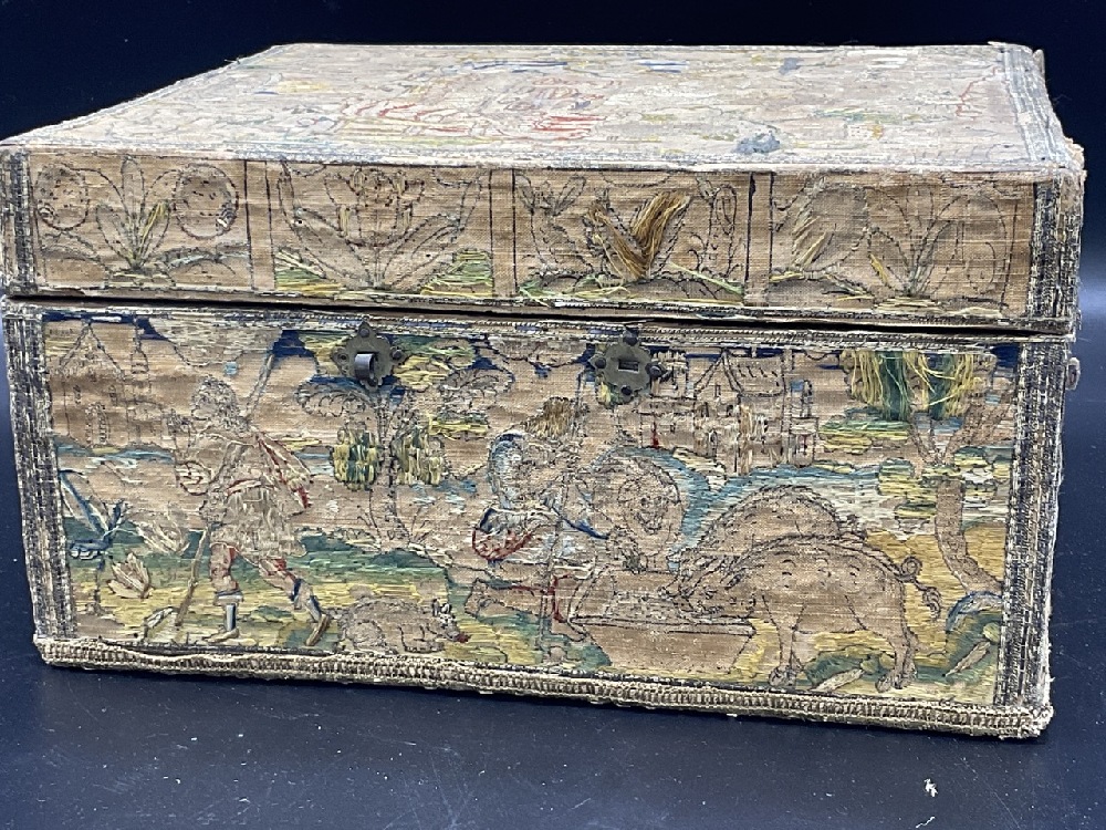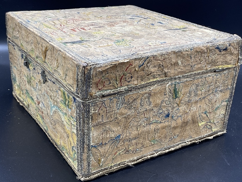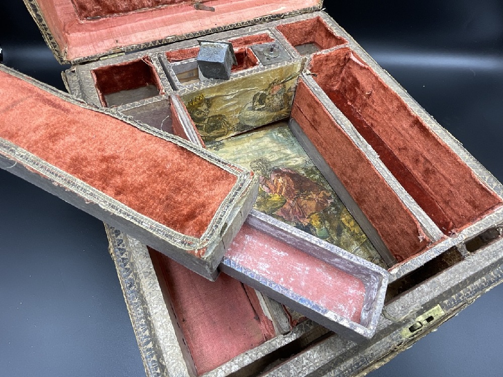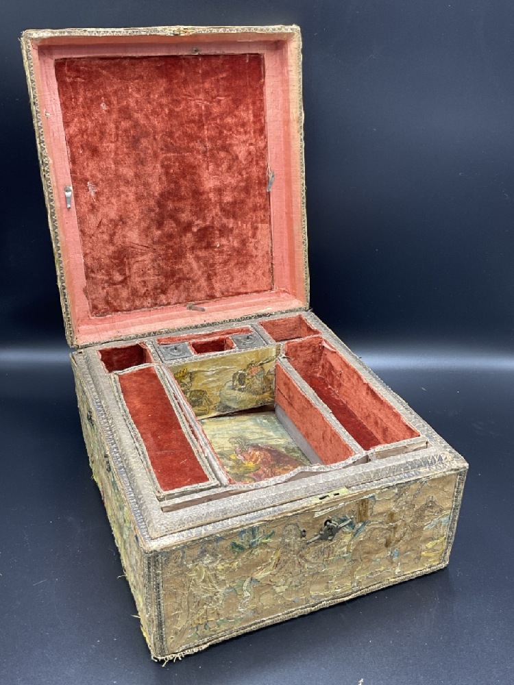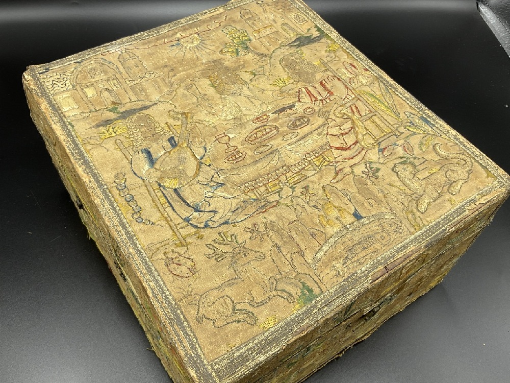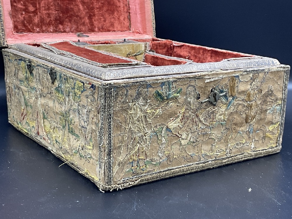 An antique embroidered folk art traveling box with compartments and lead weights.