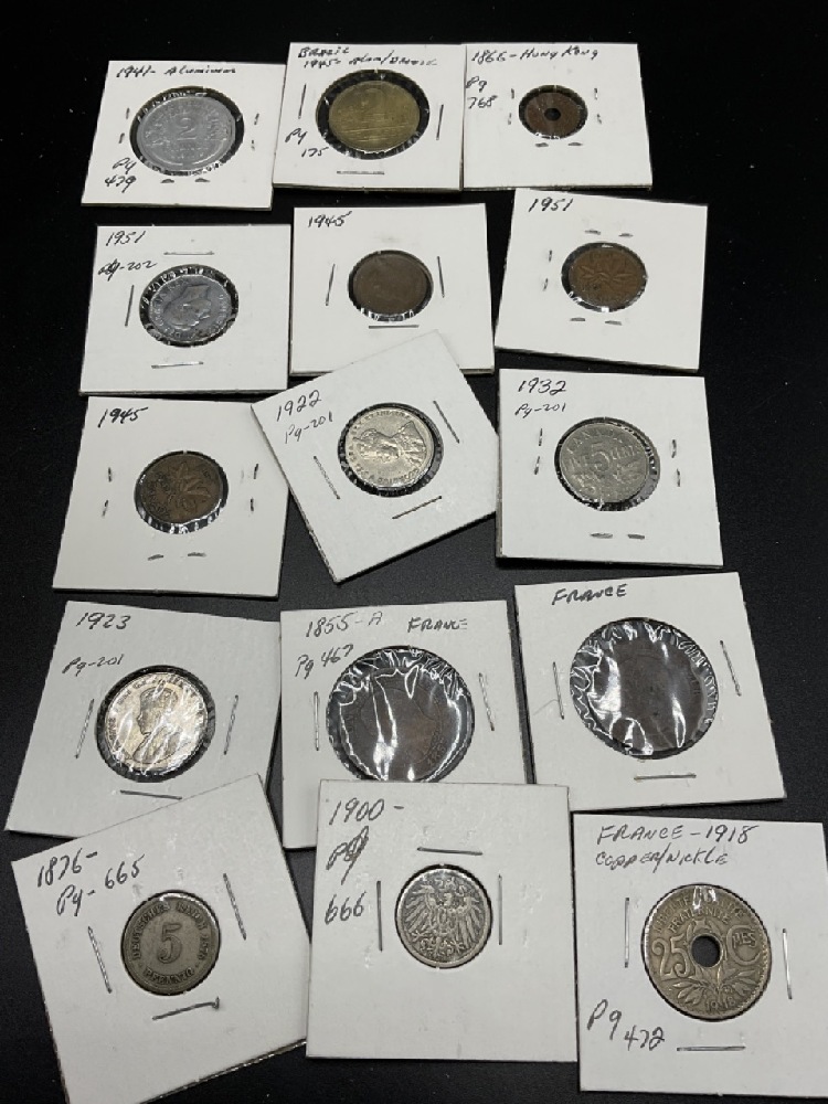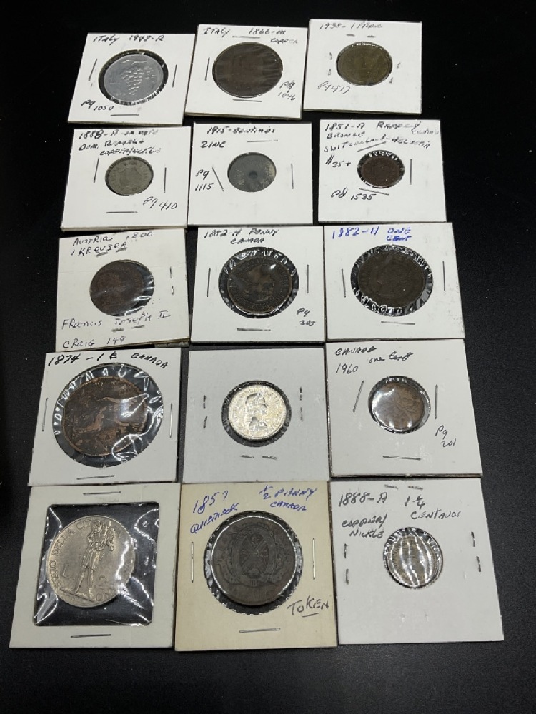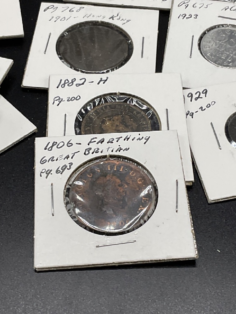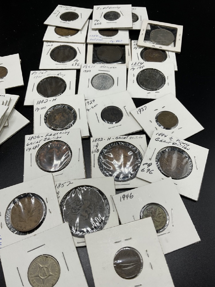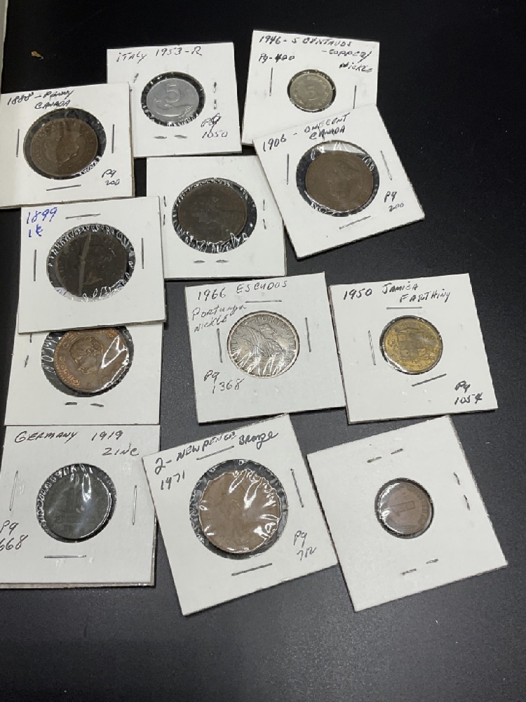 Sleeve of assorted foreign coins. Mostly Canada, Great Britain, Italy Etc. Please see photograph preview. All carded.