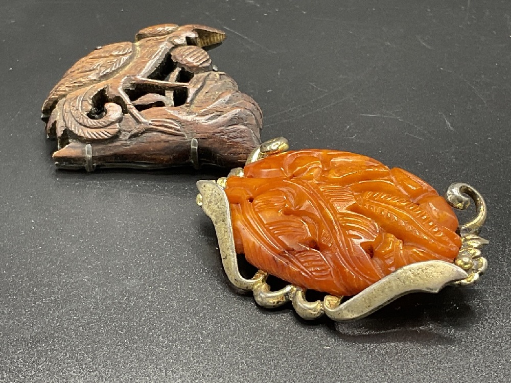 Chinese carved wood pin in sterling silver and sterling silver carved Bakelite pin.