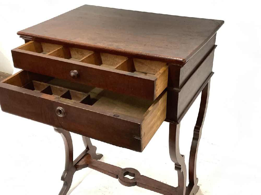 Antique sewing table. Two drawers with spool or yarn compartments.