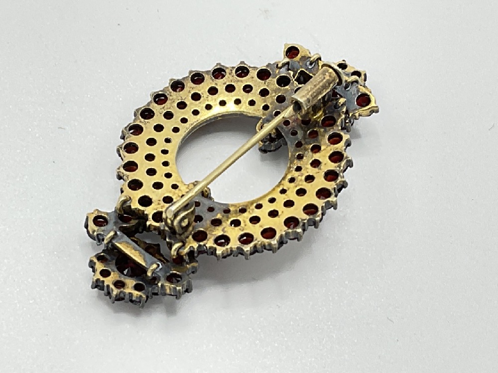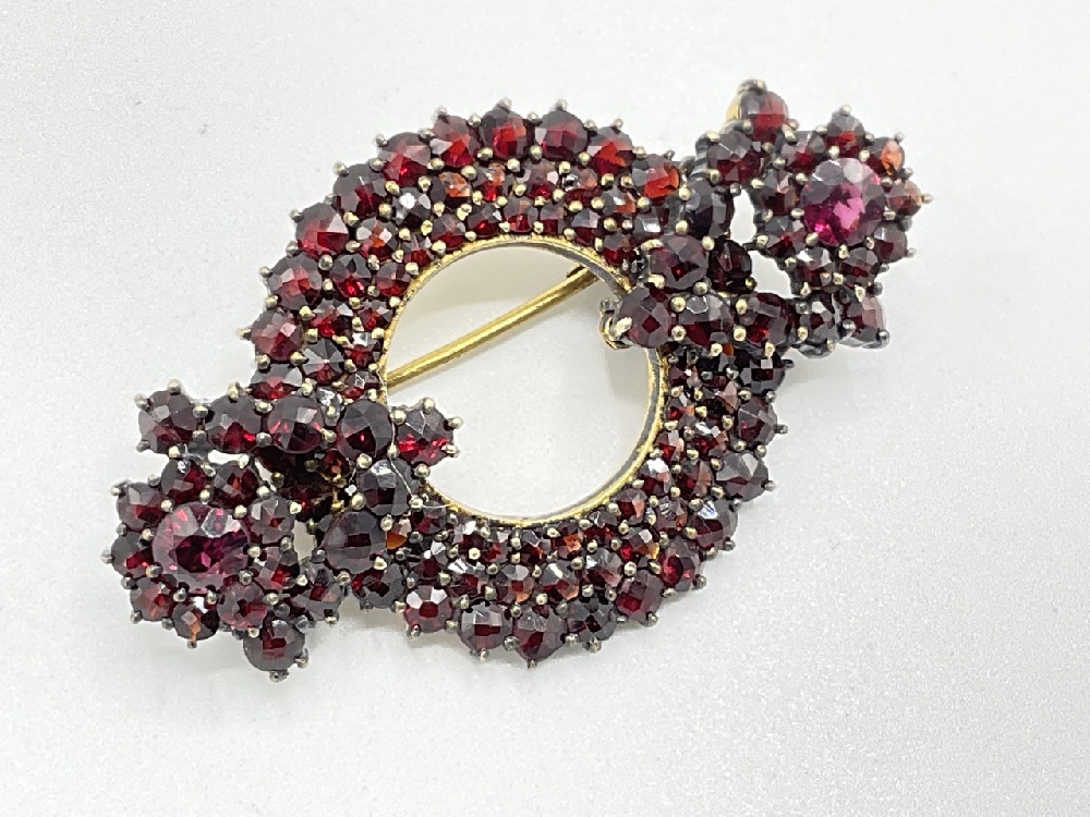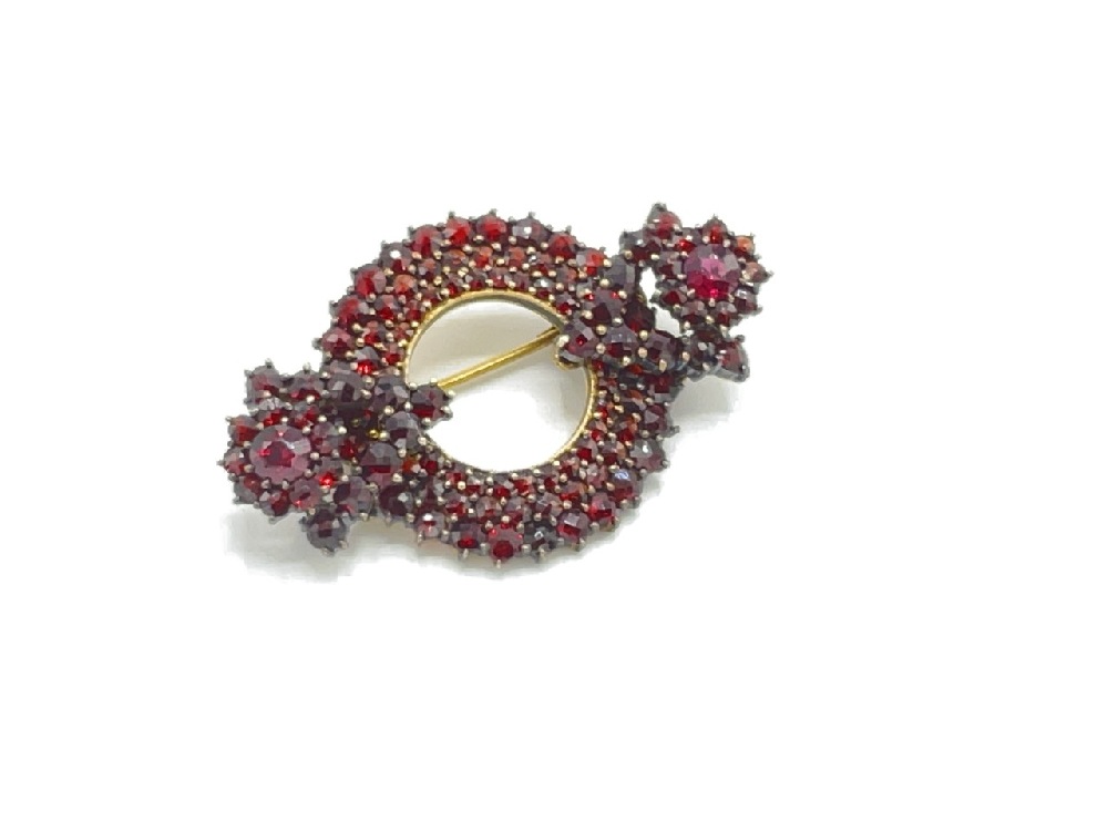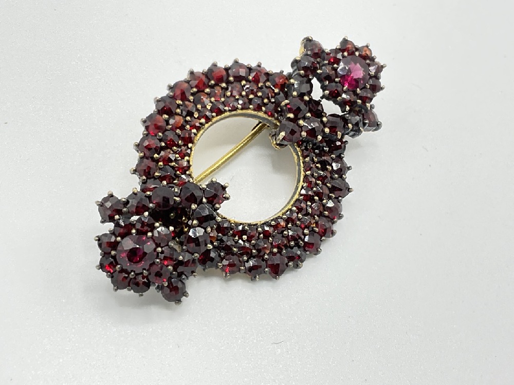Vintage Bohemian Garnet Brooch with florals at each side of circle.