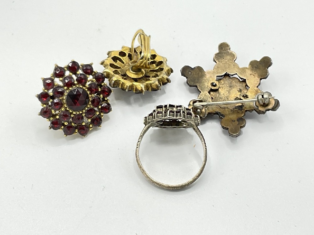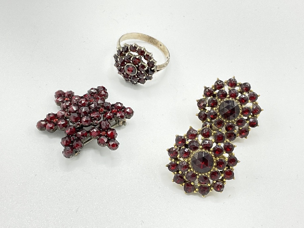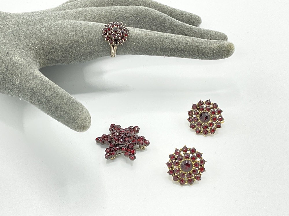 Four (4) Piece Estate Bohemian Garnet Jewelry Group. Earrings, Star Pin and Ring.