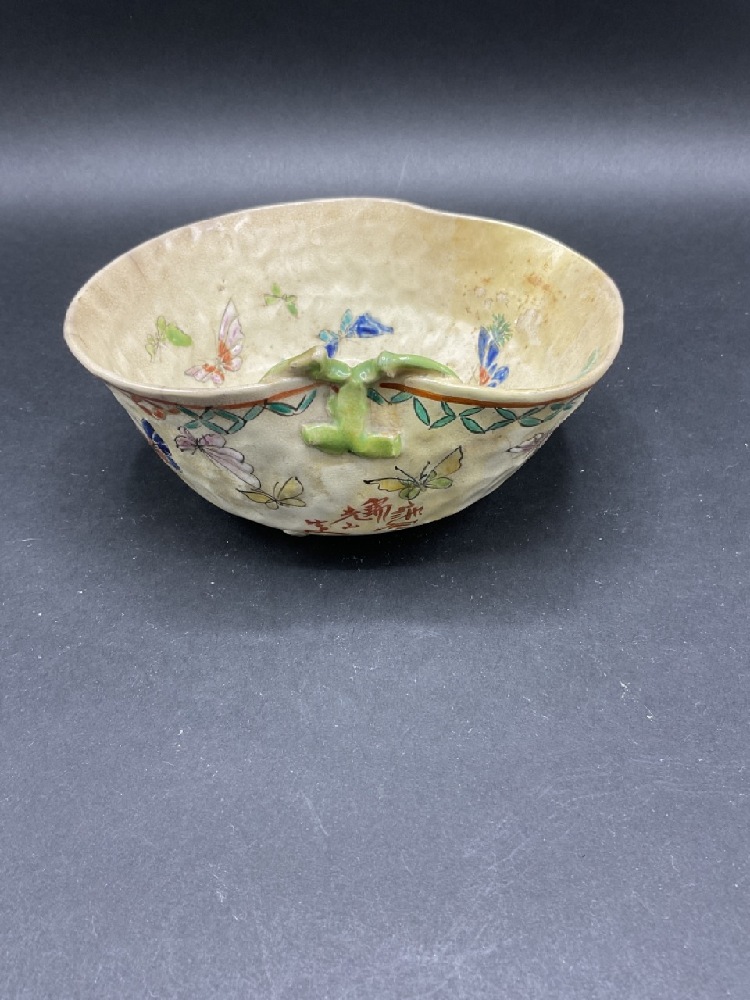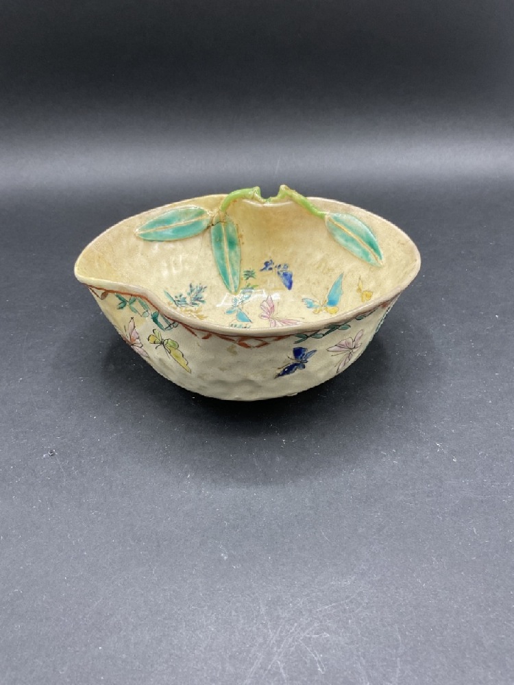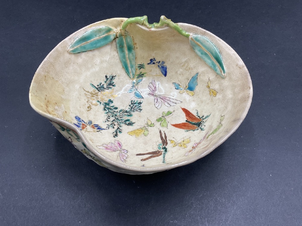 19th century signed Japanese pottery receiving dish with enameled butterflies and dragonflies.