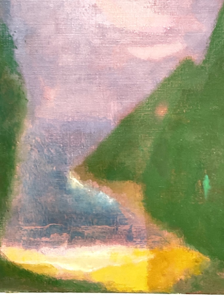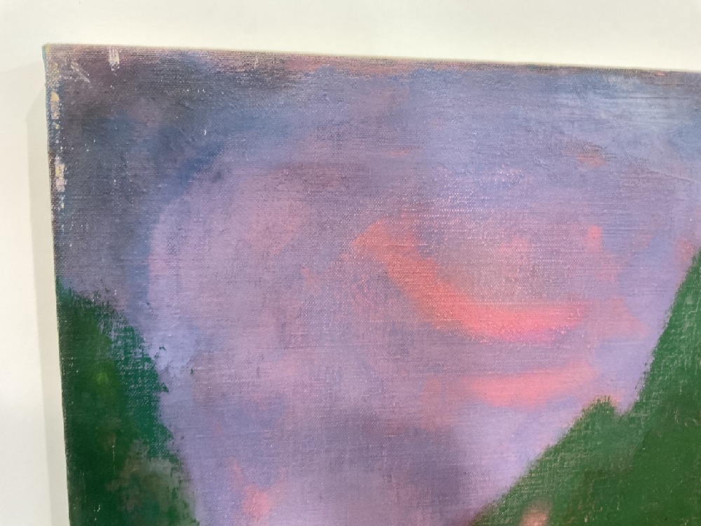 Minor paint loss upper left corner noted. Small flake lower right corner noted.