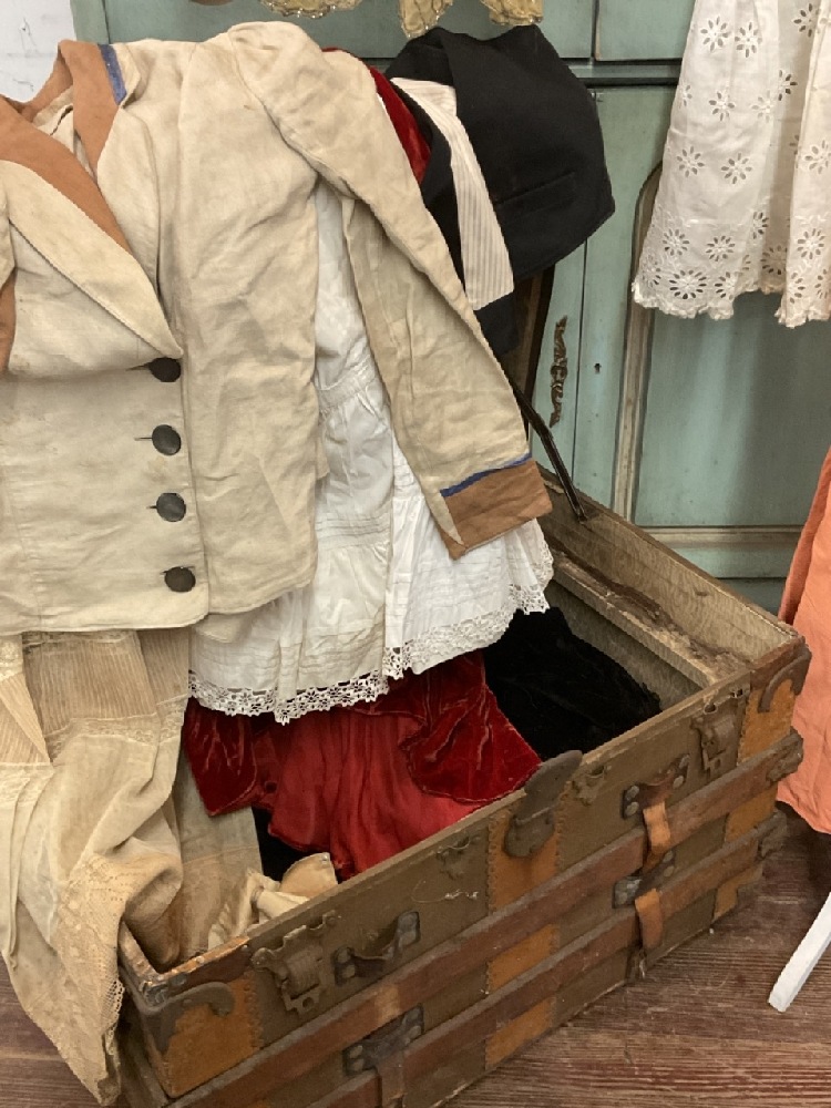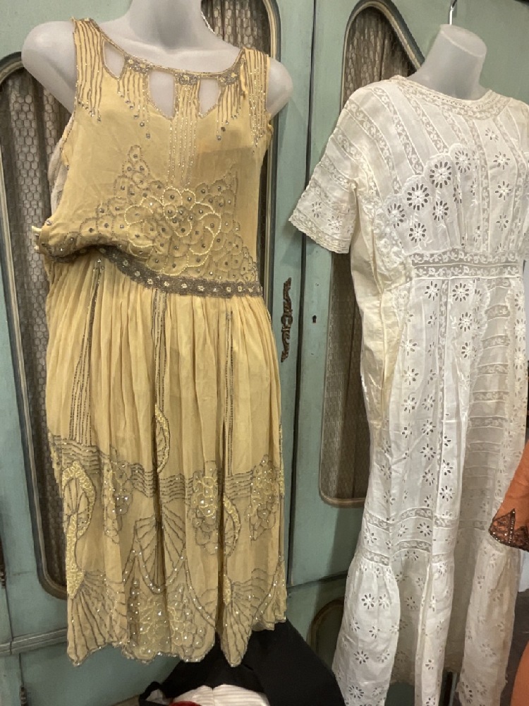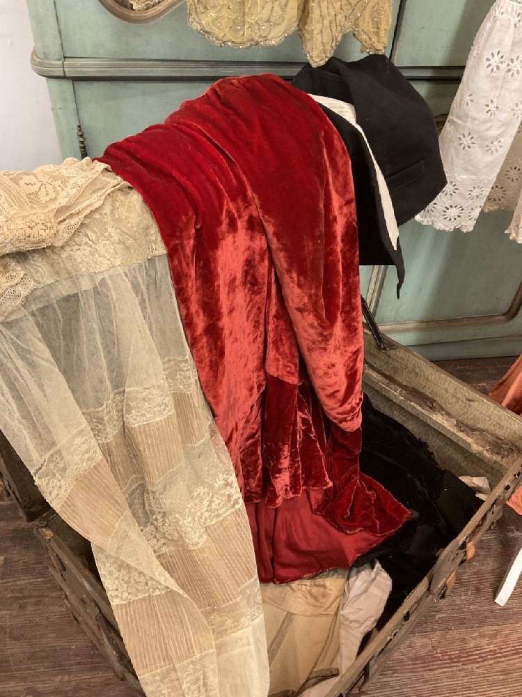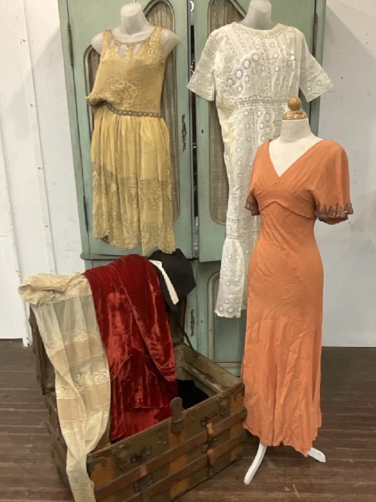 Estate compiled trunk of clothing. Victorian bodice, 1920's coral dress (two pieces) with beadwork, white lace dress, Driving jacket, beaded dress (poor), red cape and more. As seen in photograph preview.